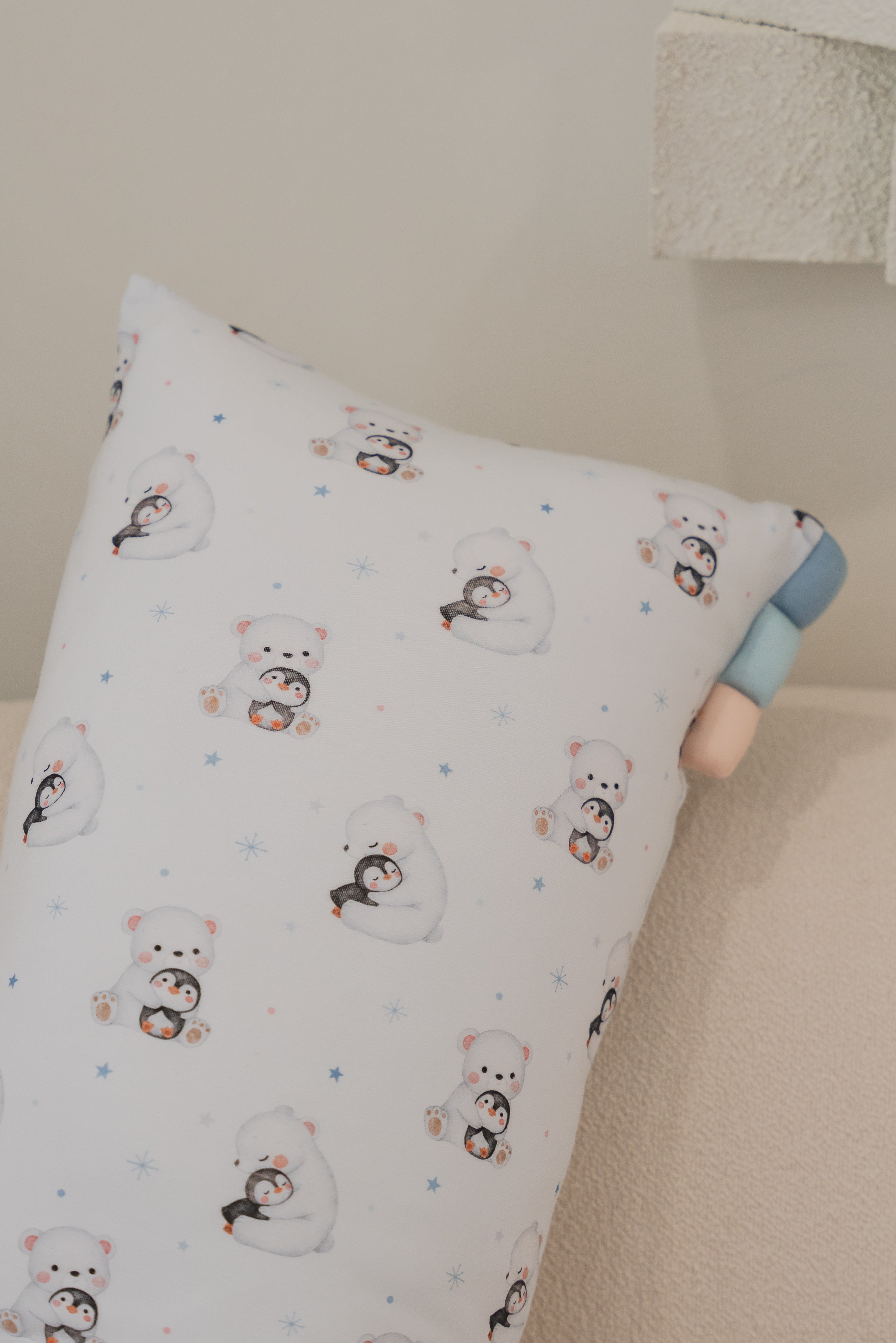 Did you know that polar bears and penguins will never meet in real life? Polar bears live in the icy expanse of the North Pole, while penguins call the South Pole their home. These two frosty friends are separated by vast hemispheres, yet here they are, nestled on a cozy bamboo pillow, accompanying your little ones through a peaceful night’s sleep. Just look at how adorable they are, hugging each other tightly—this sweet embrace symbolizes the strength and warmth of their unlikely yet unbreakable friendship.