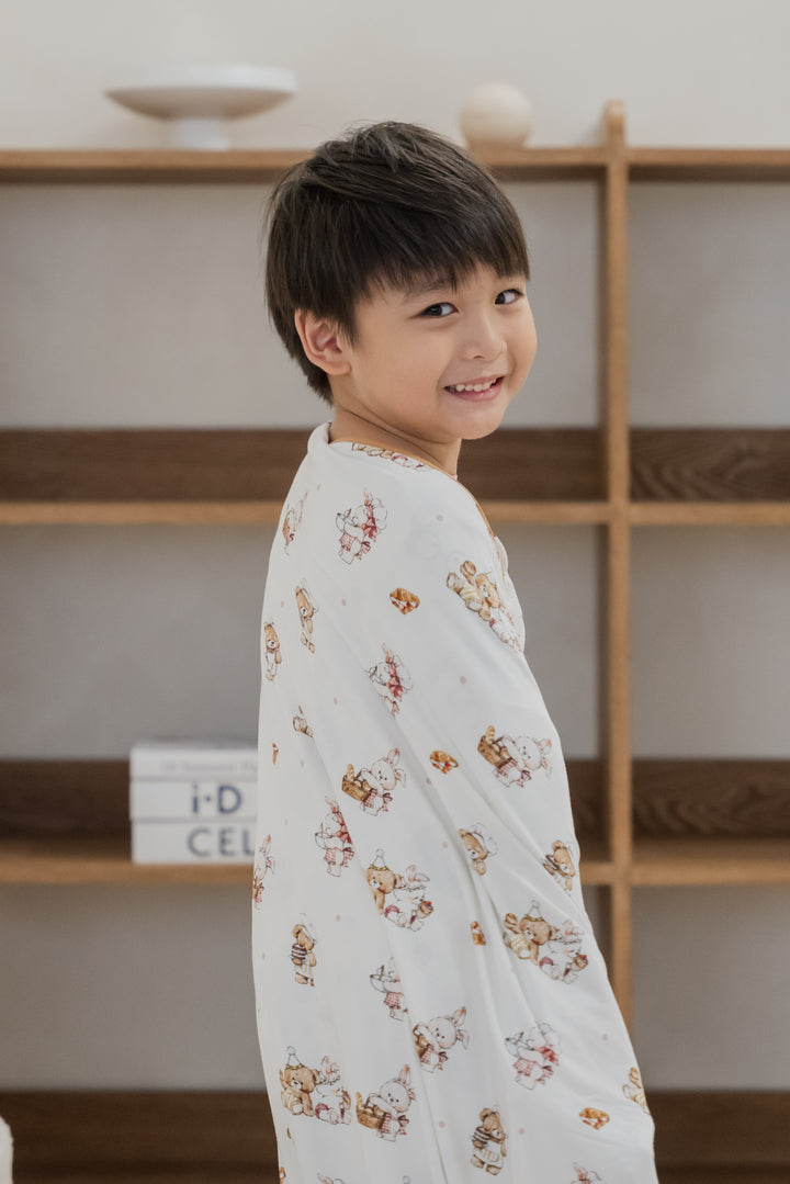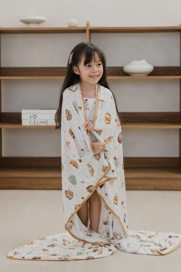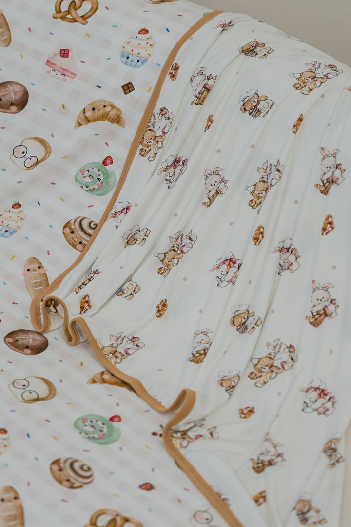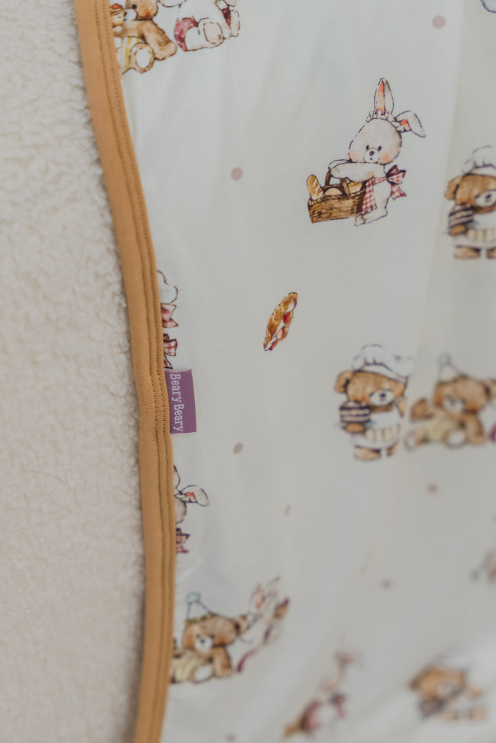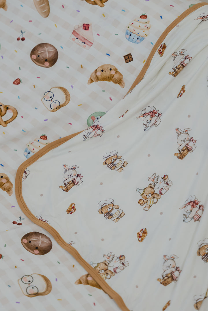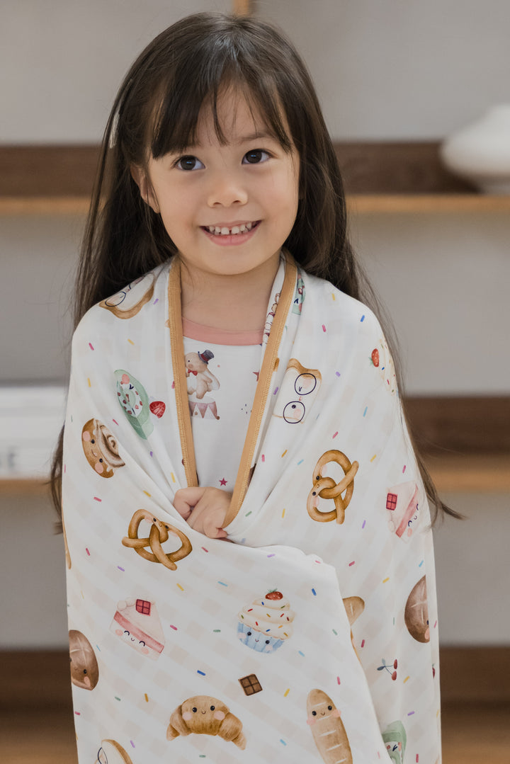 Wrap your little one in the cozy charm of our double-sided bamboo blanket, featuring two irresistibly cute bakery-inspired prints! On one side, our Joyous Bake print serves up a delightful spread of smiling pastries and cheerful confections — each one full of personality and sweetness. Flip it over to find our Bakery Café scene, where a lovable bunny and bear share their love for baking, holding their freshly made treats with pride.
