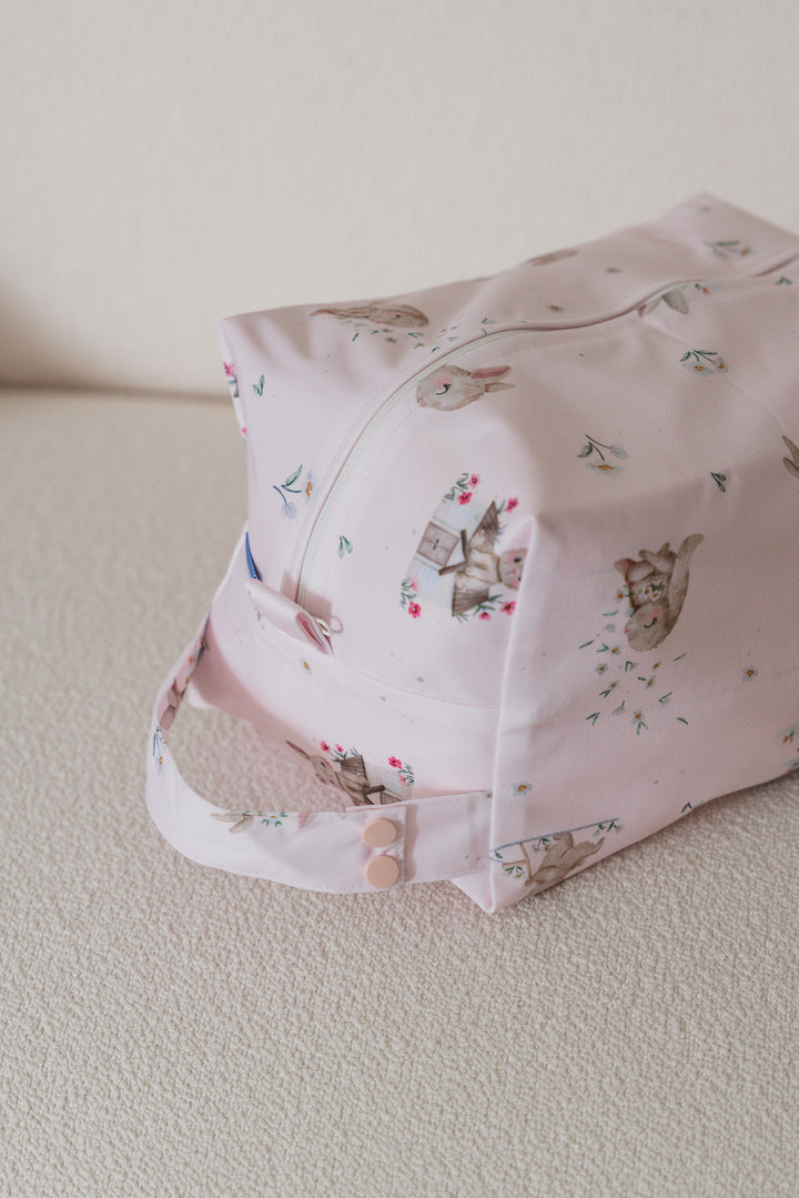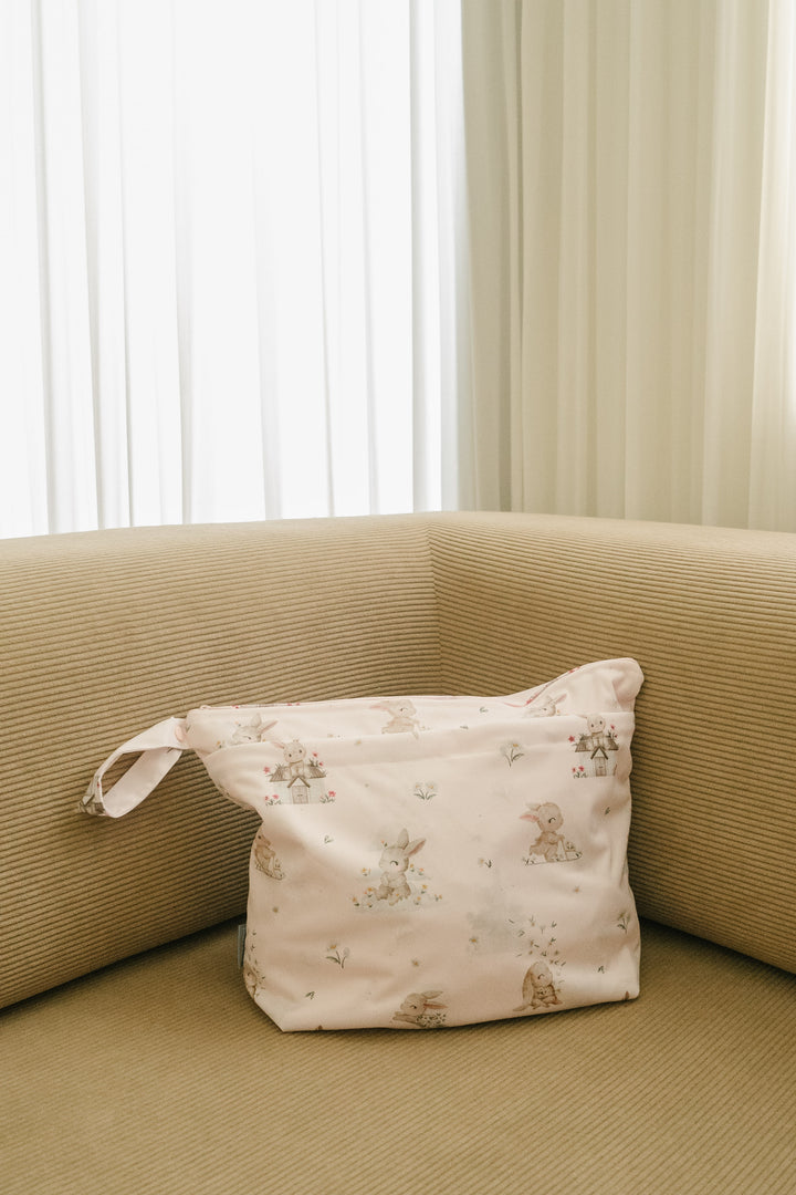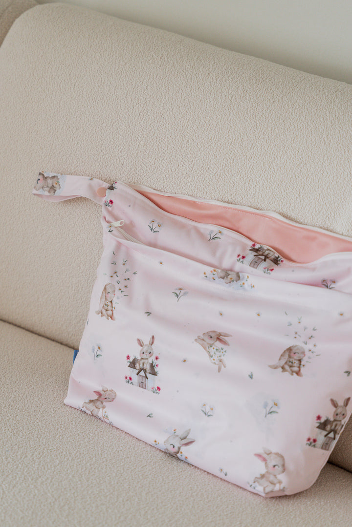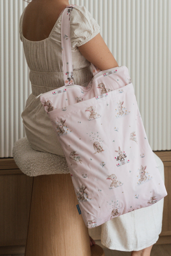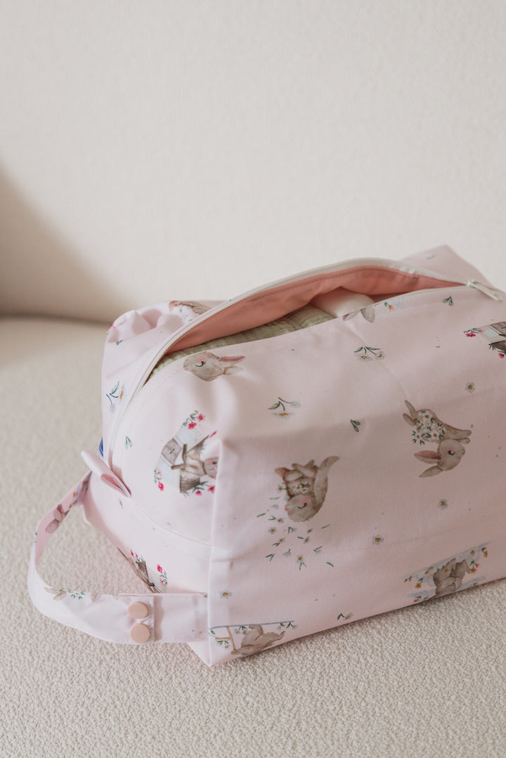 This size features double pockets to keep wet and dry items separated, with a wide opening for easy access. Ideal for childcare, it can hold bath items, gym essentials, or swimming gear. It also fits bedding essentials like a blanket and our medium-sized pillow.