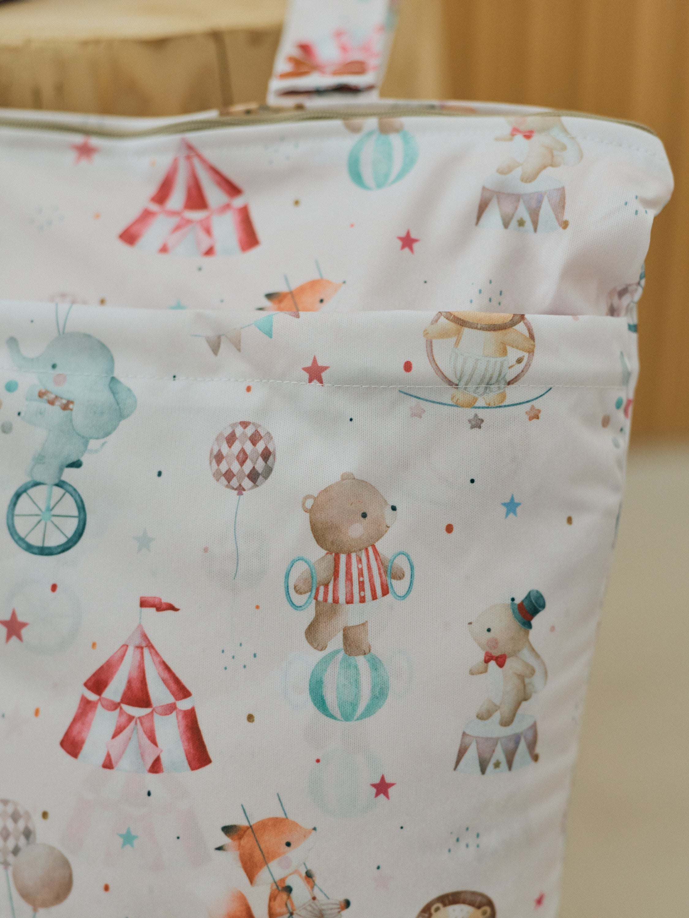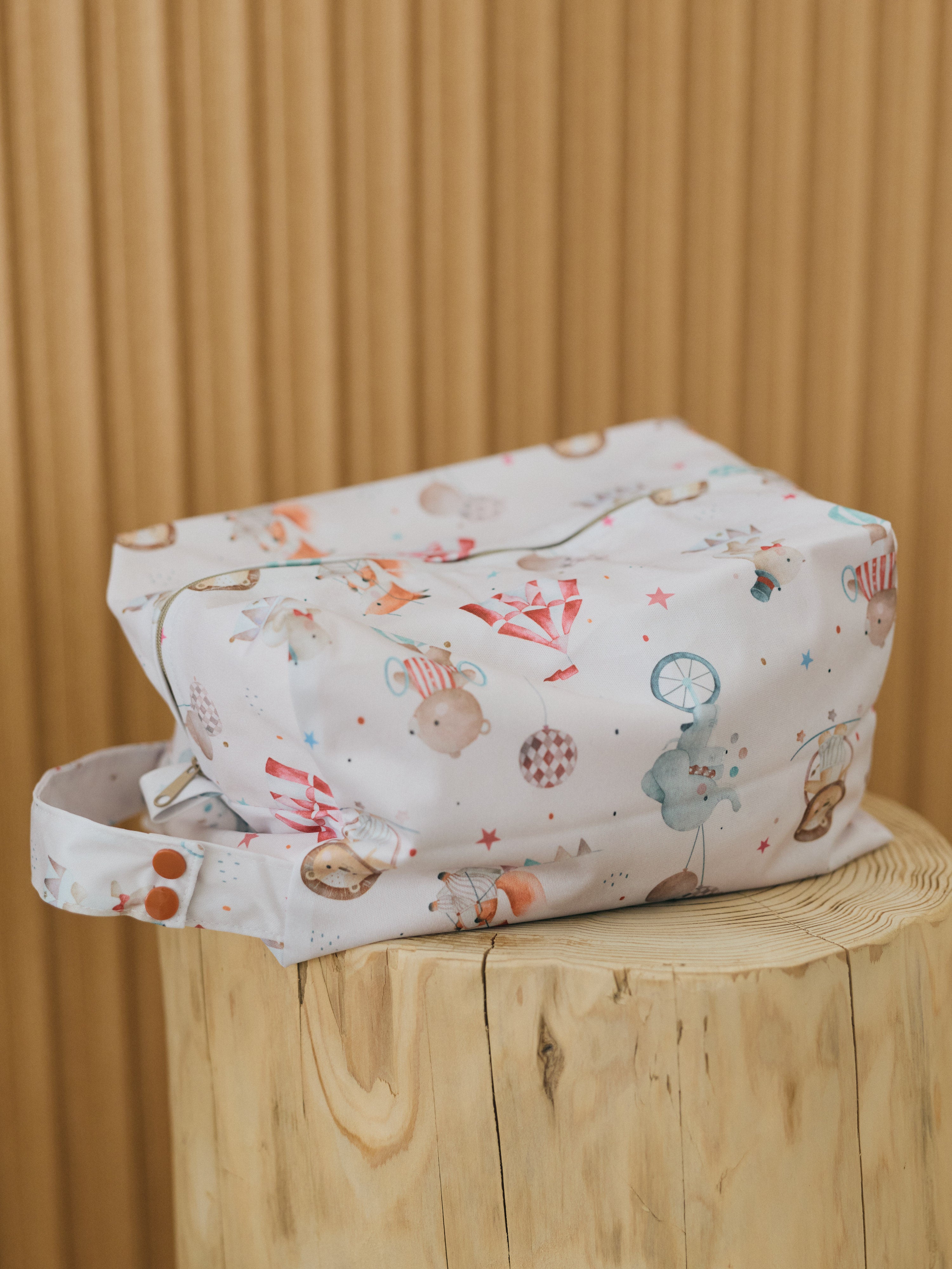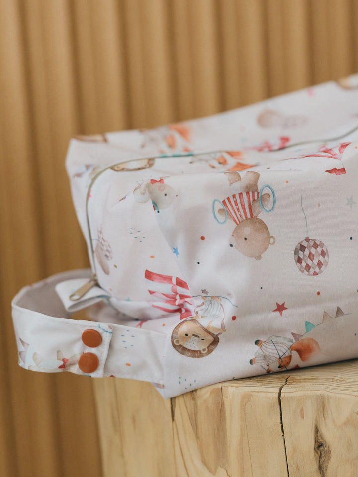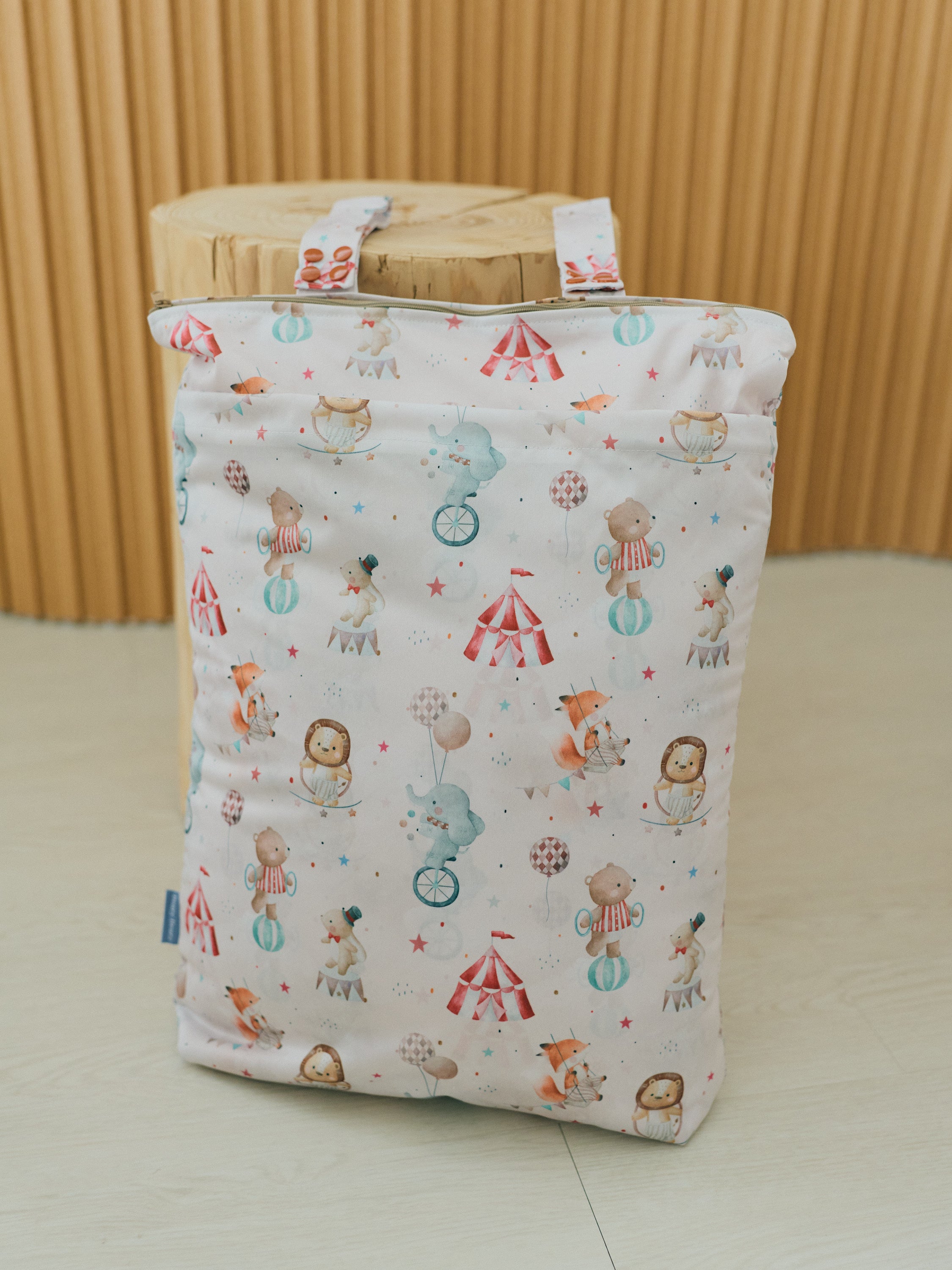 This size features double pockets to keep wet and dry items separated, with a wide opening for easy access. Ideal for childcare, it can hold bath items, gym essentials, or swimming gear. It also fits bedding essentials like a blanket and our medium-sized pillow.