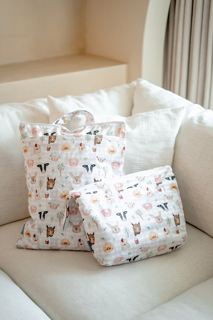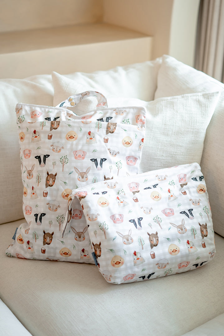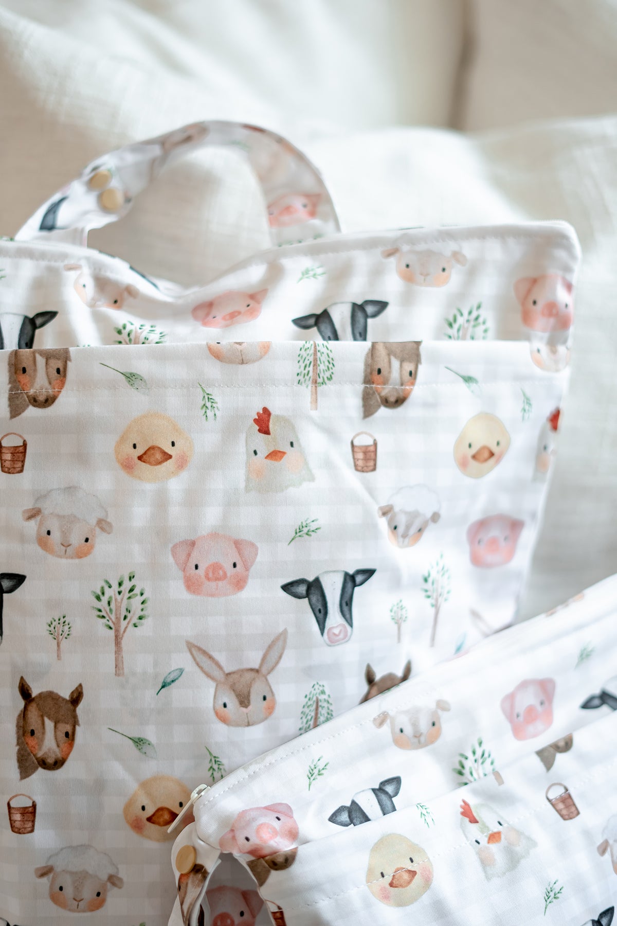 It has double pockets to separate out the wet and dry items, spaciously sized for easy access. Thoughtfully designed with snap button handle to hang on stroller or bathroom. Lastly it is double-lined and sewn with ykk zip for extended durability.