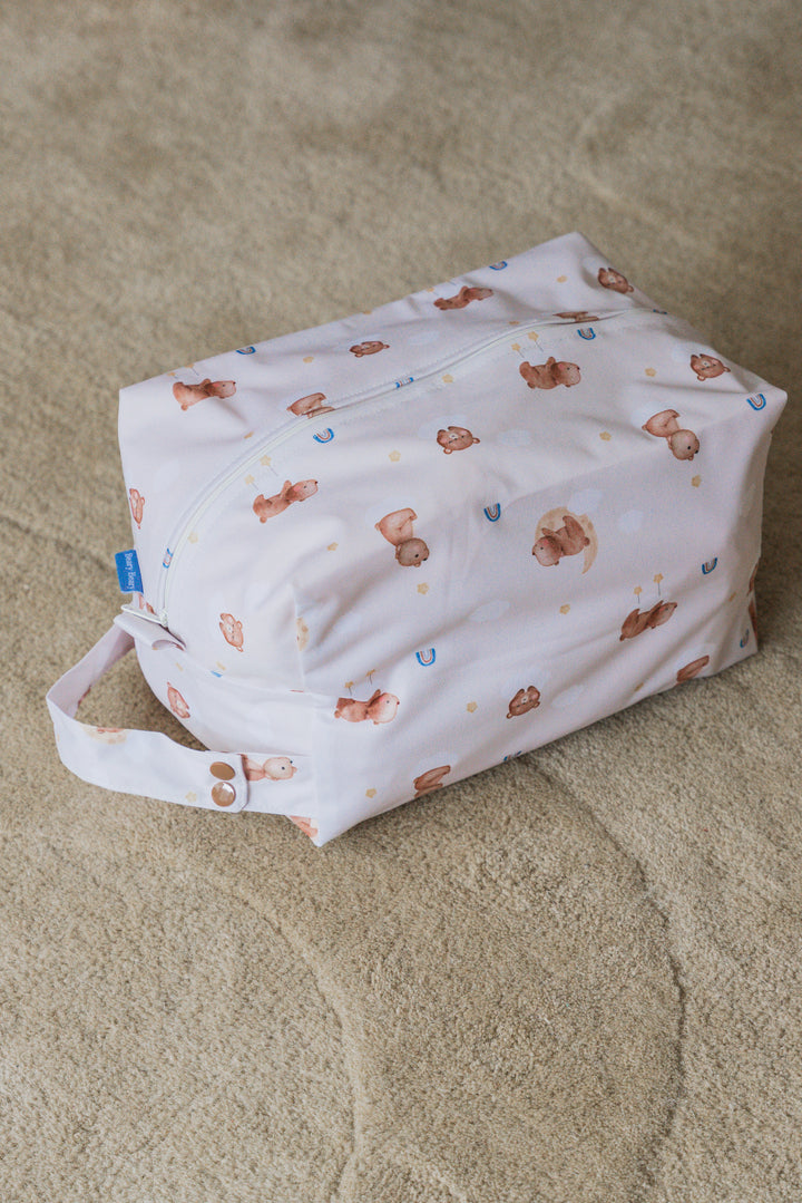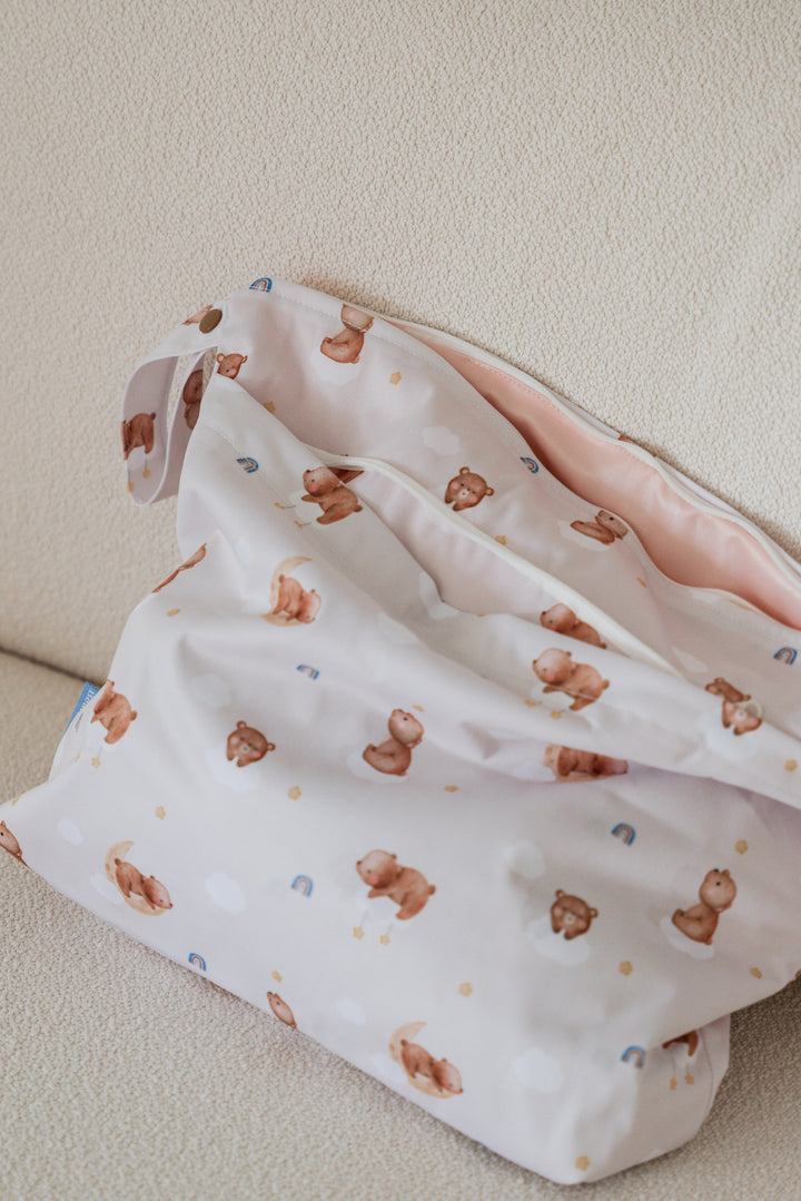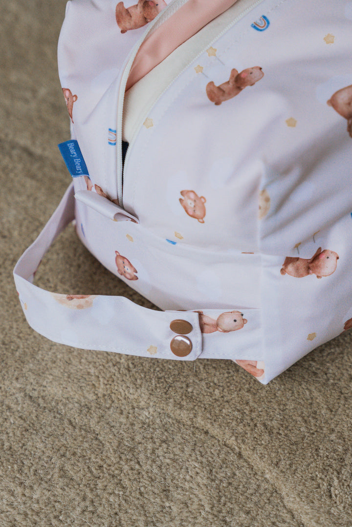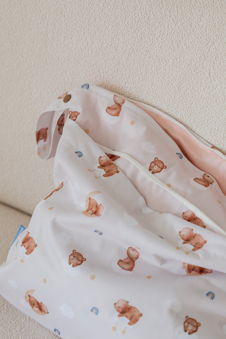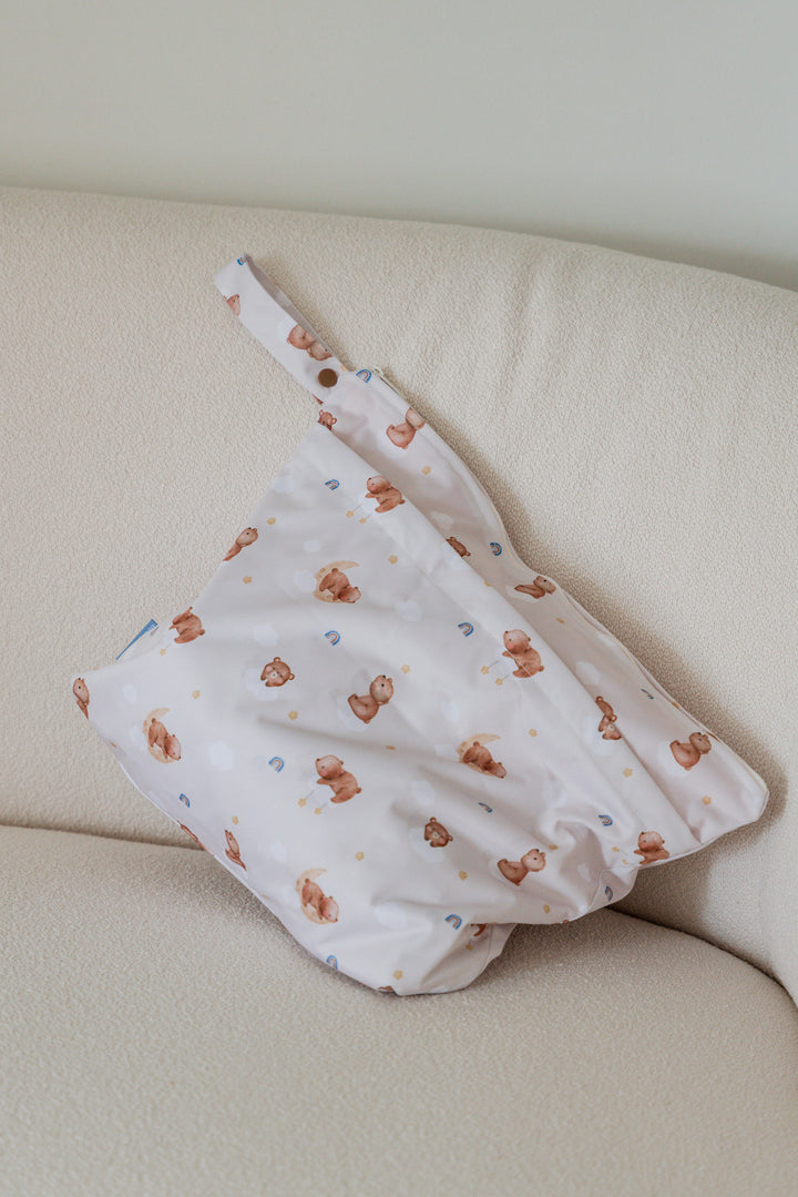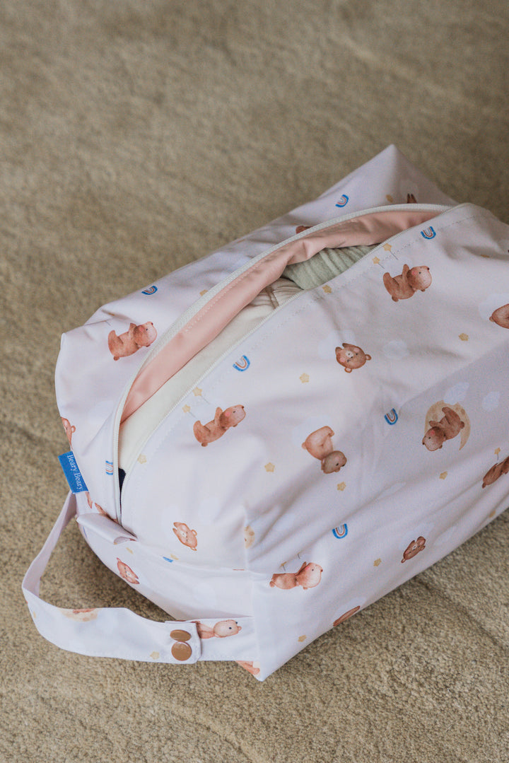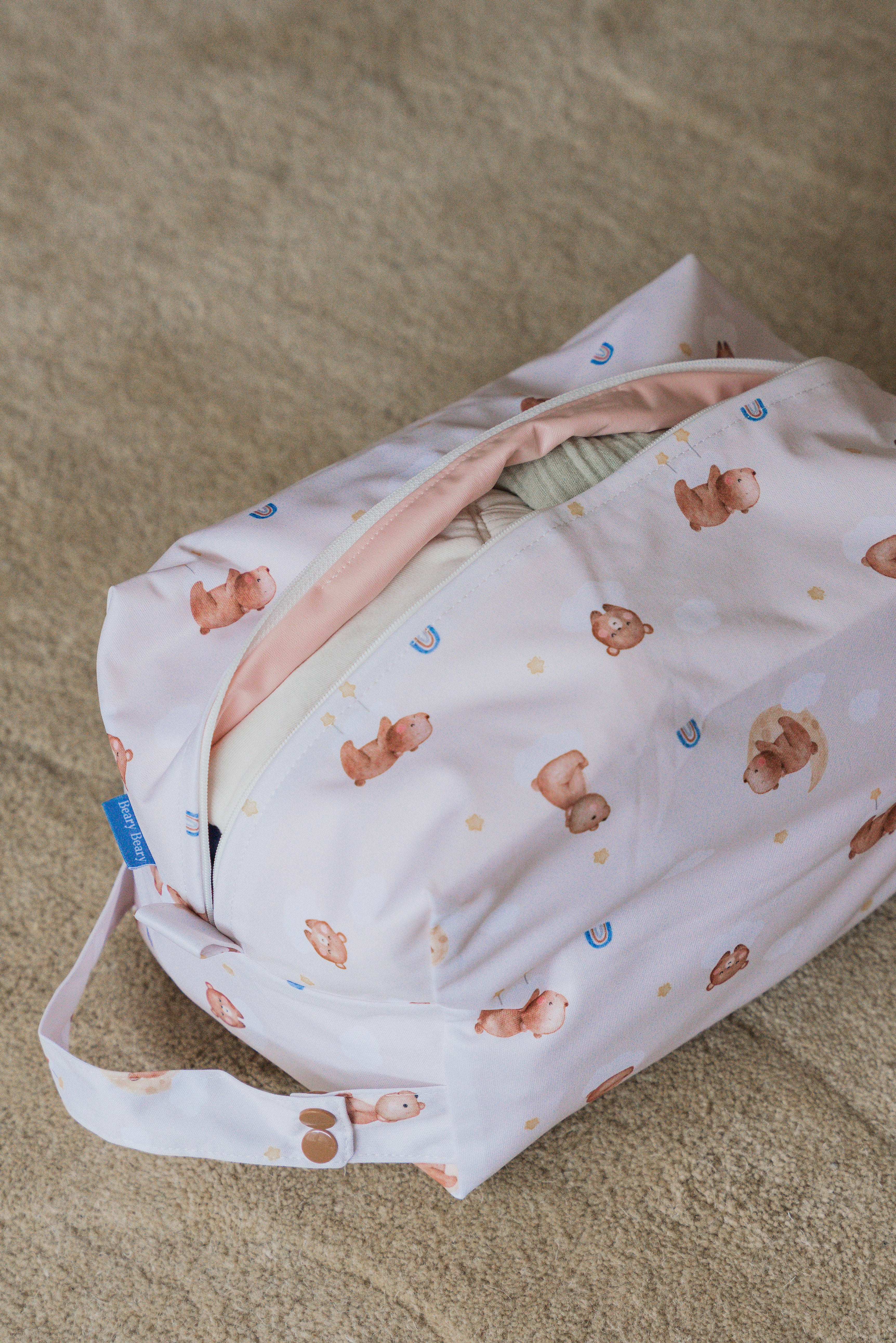 This size features double pockets to keep wet and dry items separated, with a wide opening for easy access. Ideal for childcare, it can hold bath items, gym essentials, or swimming gear. It also fits bedding essentials like a blanket and our medium-sized pillow.