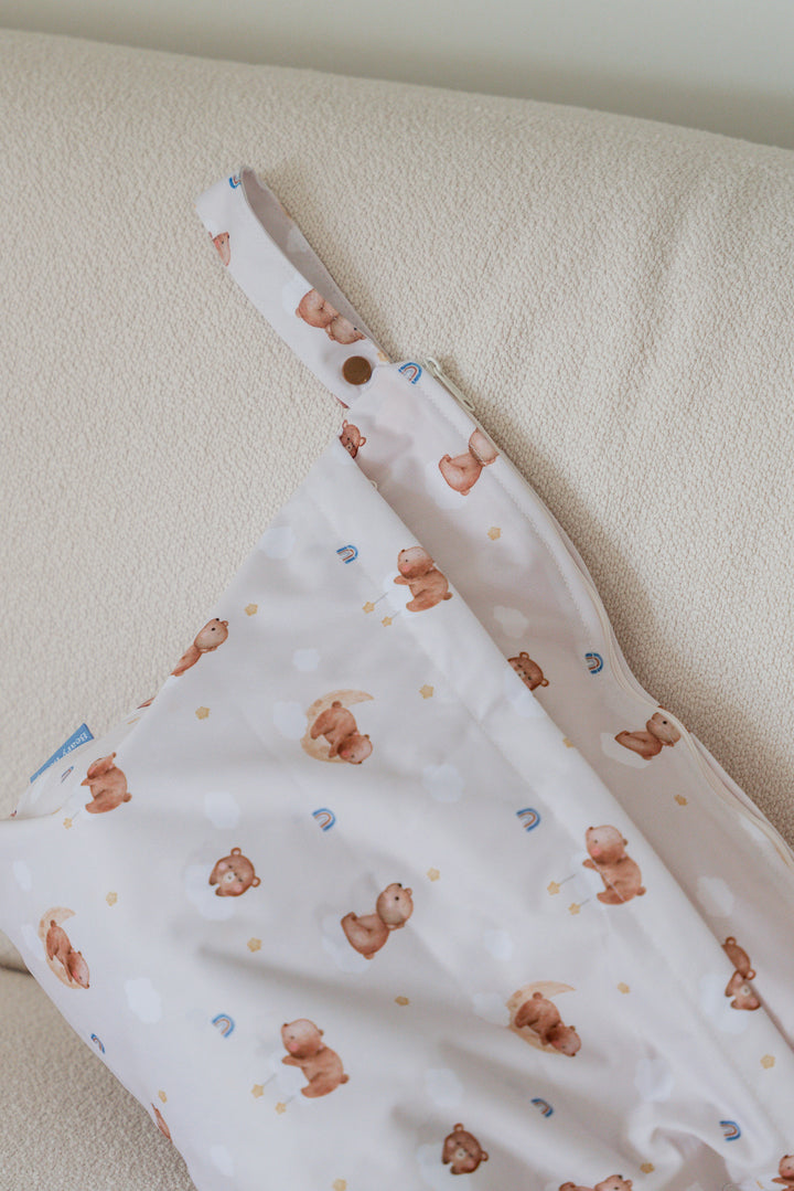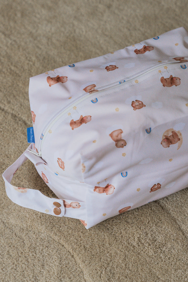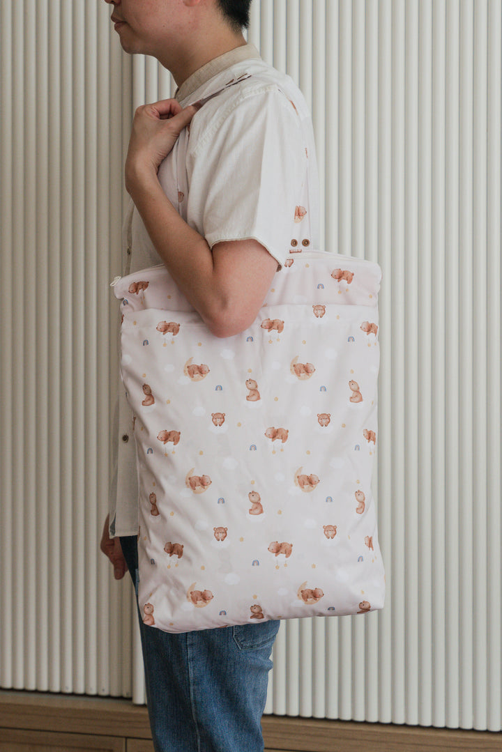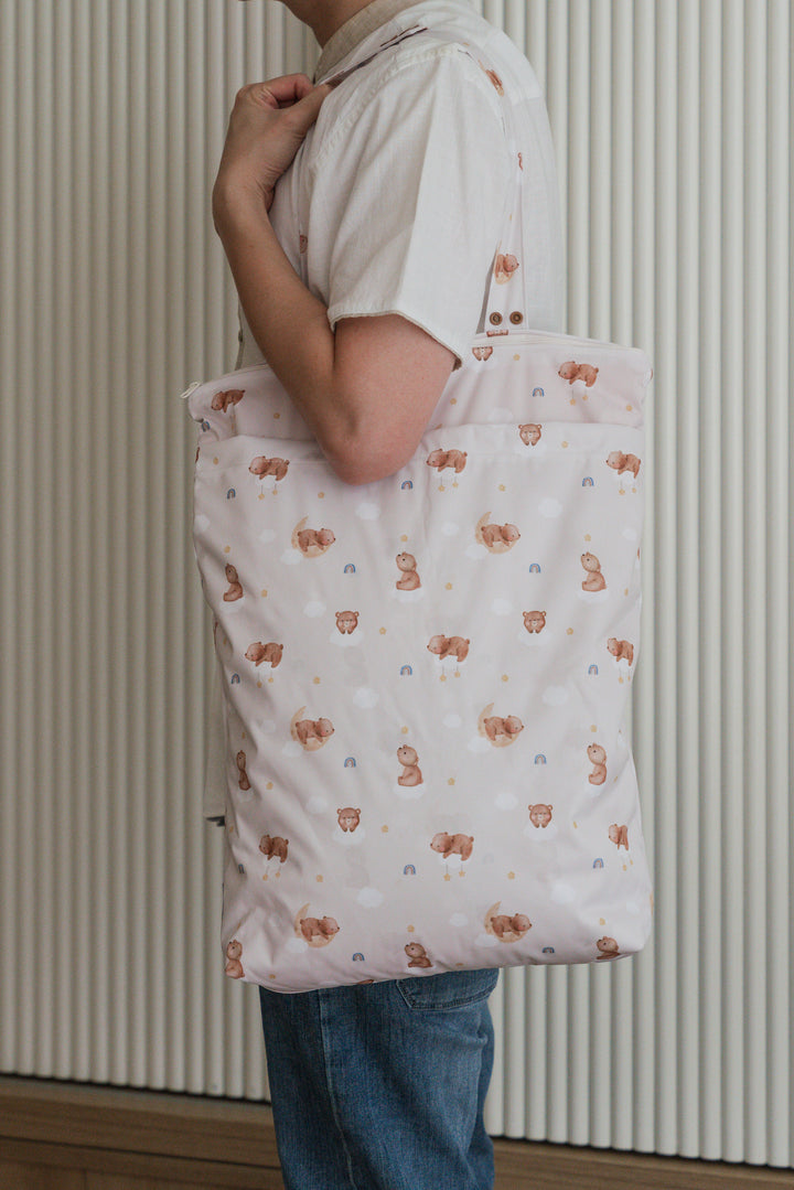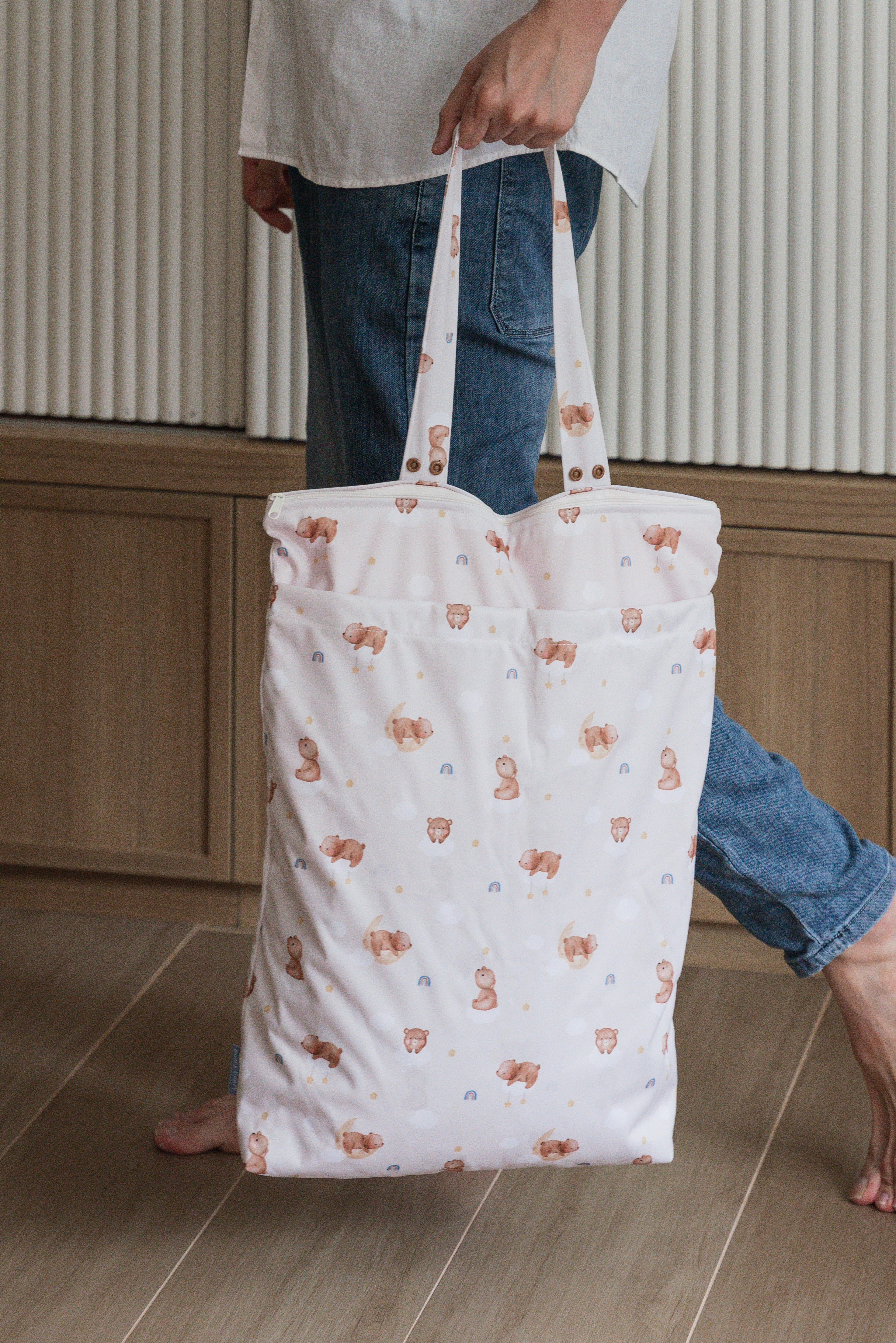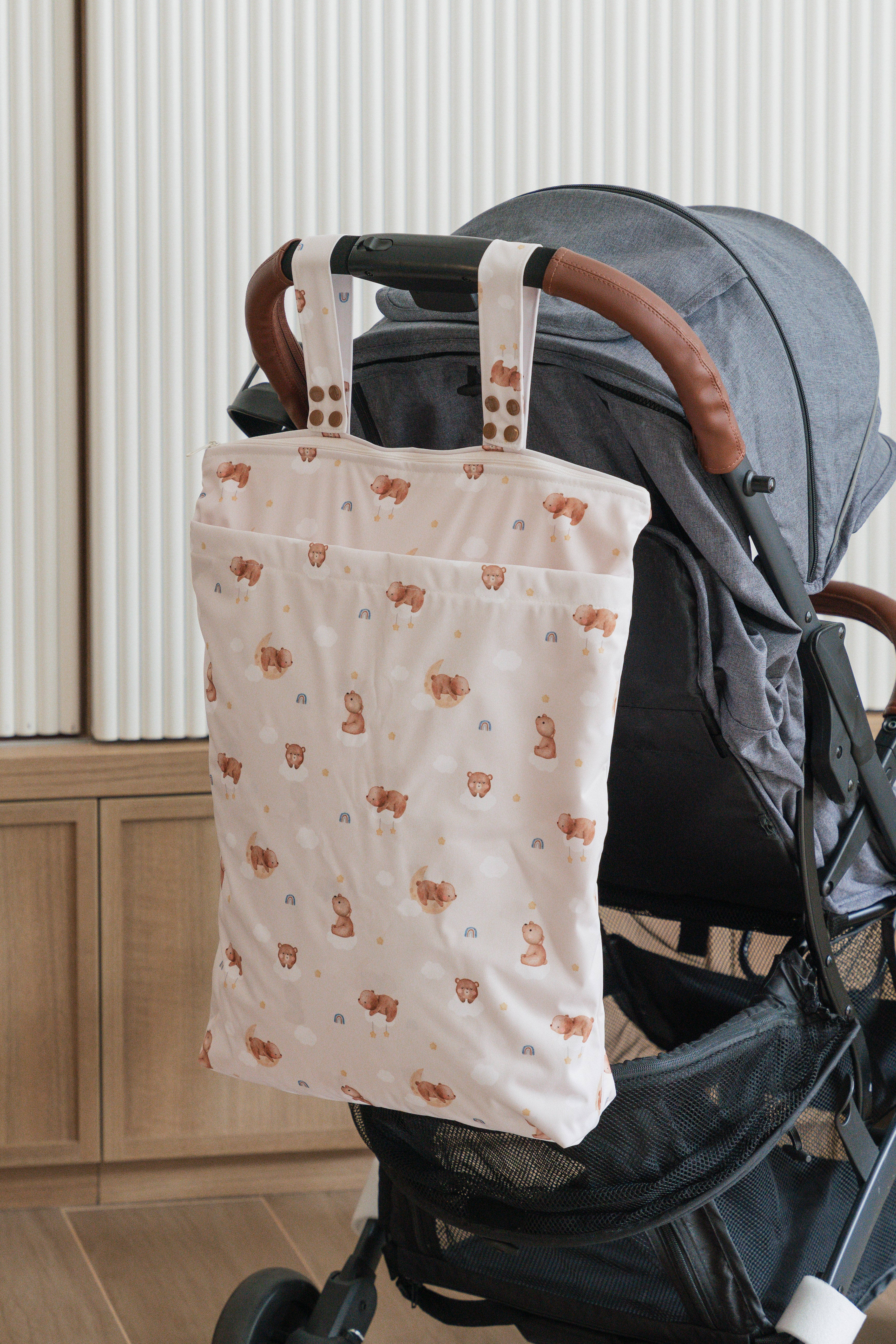 The spacious Size L wet bag also has double pockets for organizing wet and dry items. Perfect for larger items, it serves as an excellent swim bag or storage for sleeping essentials. It can comfortably fit one Toddler Head Pillow or two L-sized pillows. With its double strap design, this bag can be easily hung on a stroller or converted into a shoulder bag, allowing you to carry it hands-free!