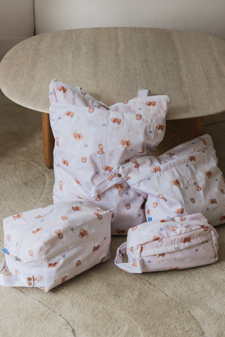Our reusable, water-resistant wet bags are available in four thoughtfully designed sizes, ensuring a perfect fit for every need.
