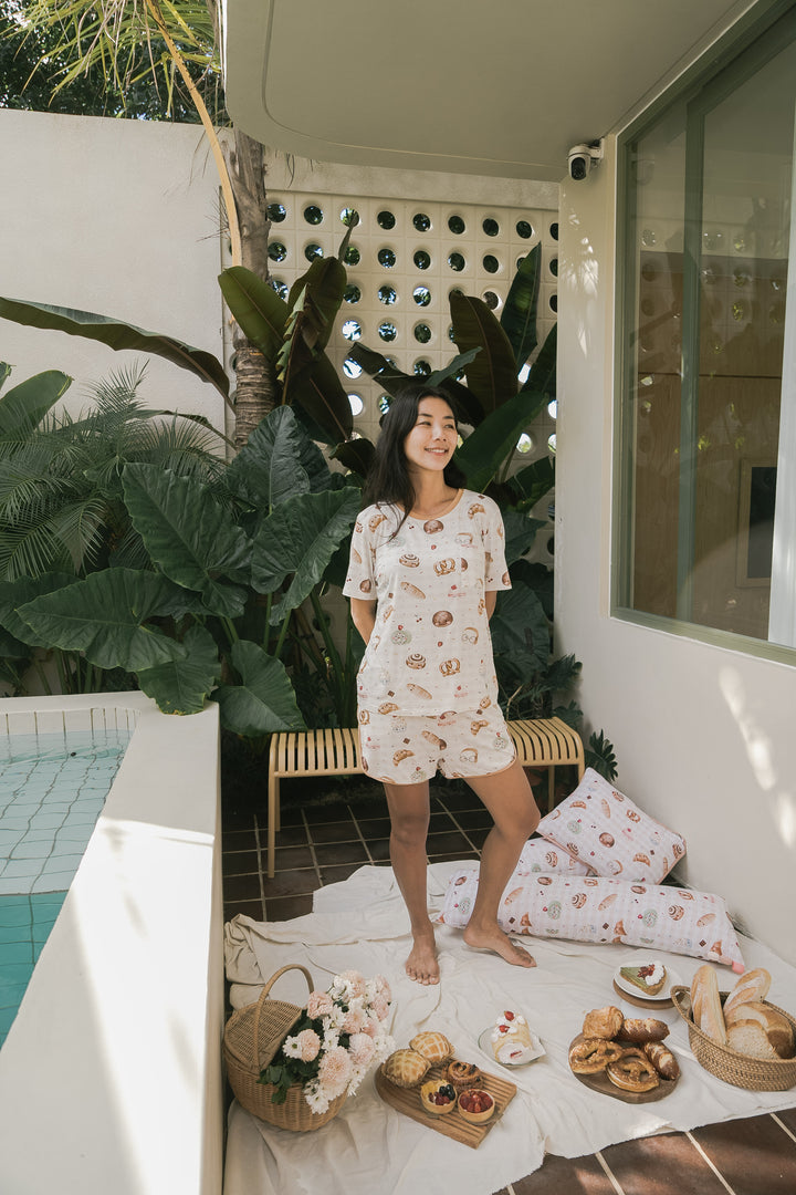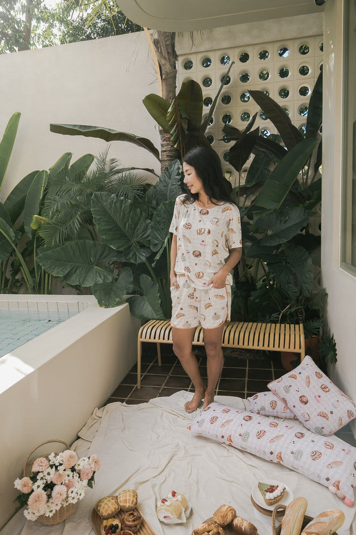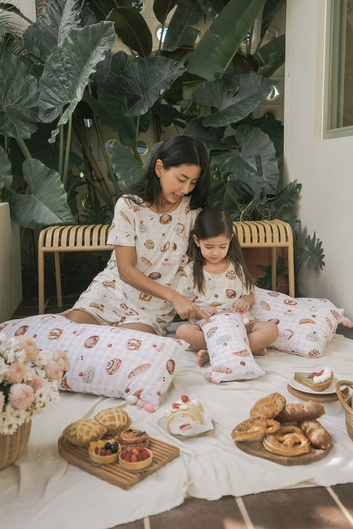 Our bakery-themed pillows feature smiley-faced treats like croissants, cinnamon rolls, Swiss rolls, pretzels, hot cross buns, white loaf bread, cupcakes, cake, and even a cheerful little baguette! Each pillow pops against a delightful background sprinkled with rainbow sprinkles, chocolatey bits, and cherries — making every cuddle feel like a trip to a magical bakery!