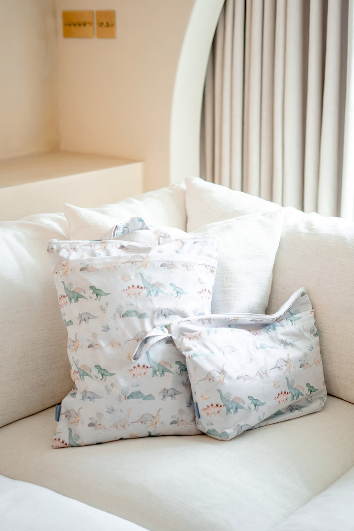 It has double pockets to separate out the wet and dry items, spaciously sized for easy access. Thoughtfully designed with snap button handle to hang on stroller or bathroom. Lastly it is double-lined and sewn with ykk zip for extended durability.