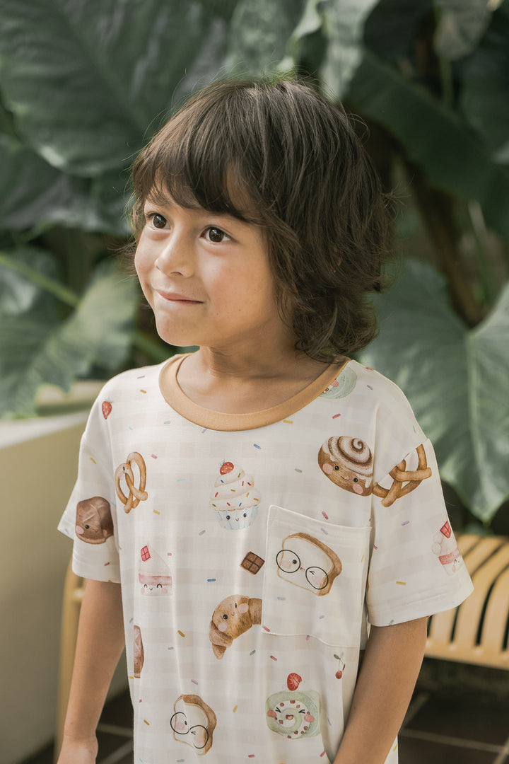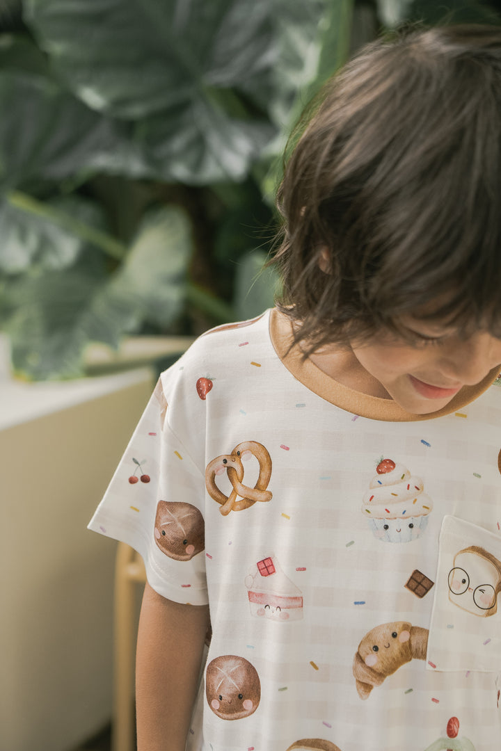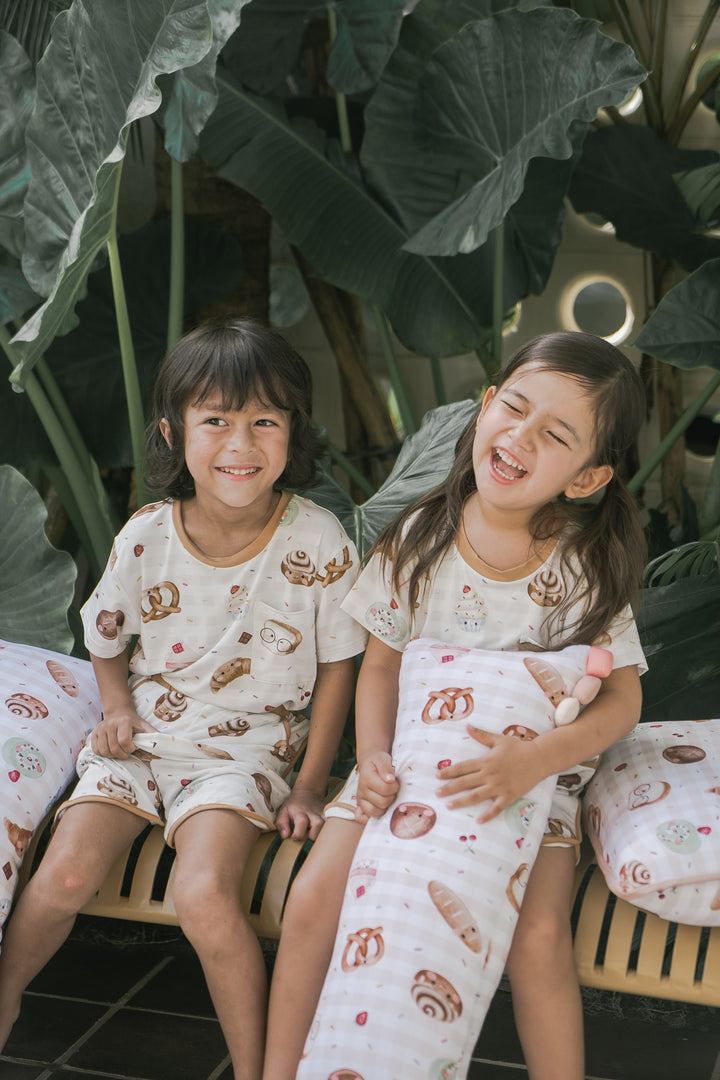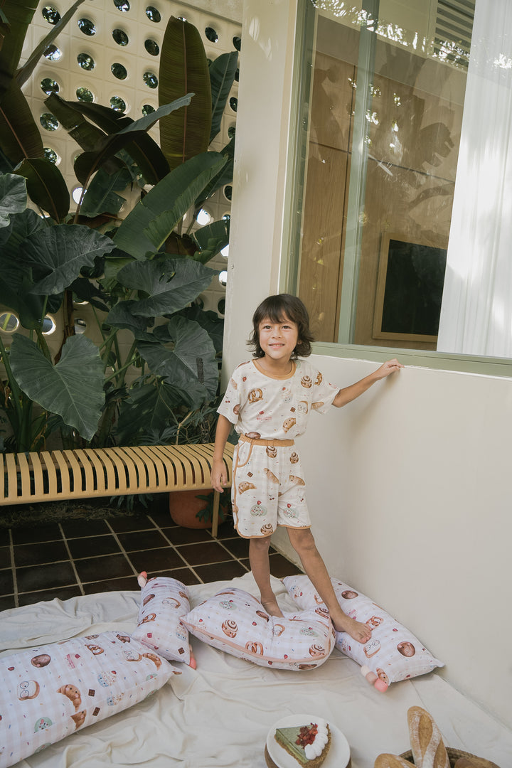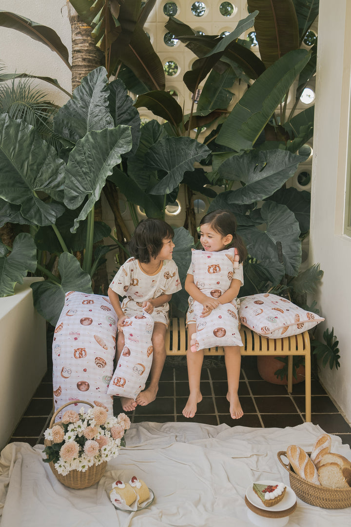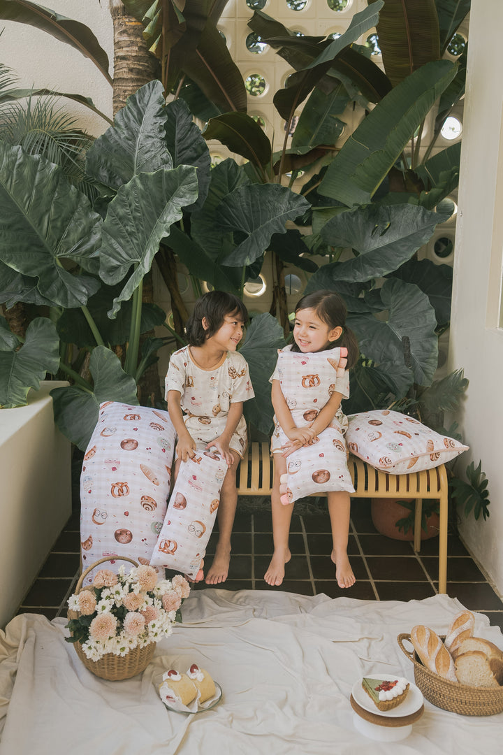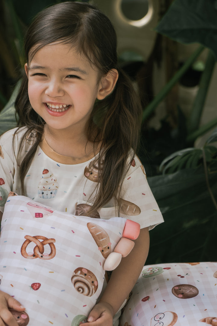 Our bakery-themed pillows feature smiley-faced treats like croissants, cinnamon rolls, Swiss rolls, pretzels, hot cross buns, white loaf bread, cupcakes, cake, and even a cheerful little baguette! Each pillow pops against a delightful background sprinkled with rainbow sprinkles, chocolatey bits, and cherries — making every cuddle feel like a trip to a magical bakery!