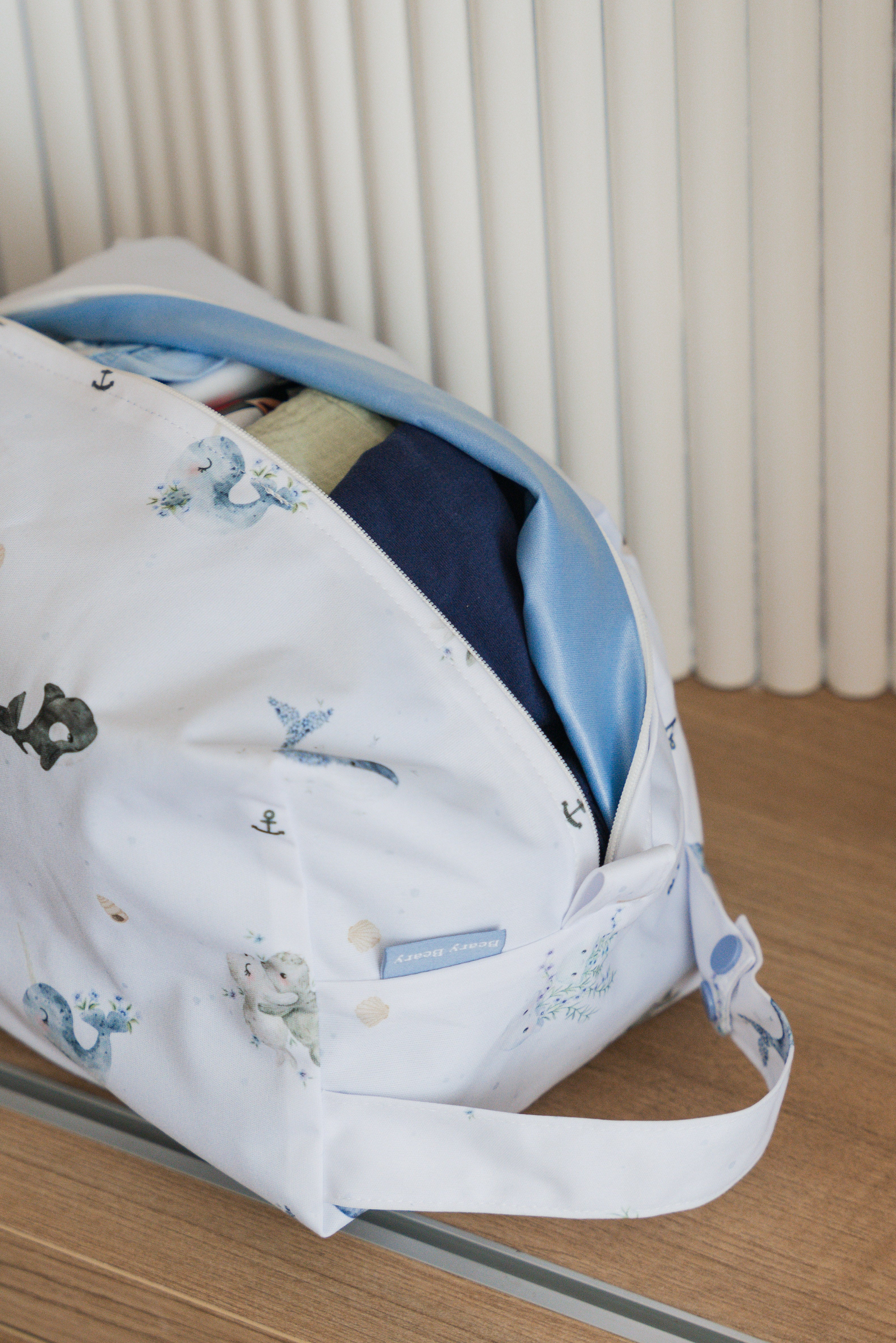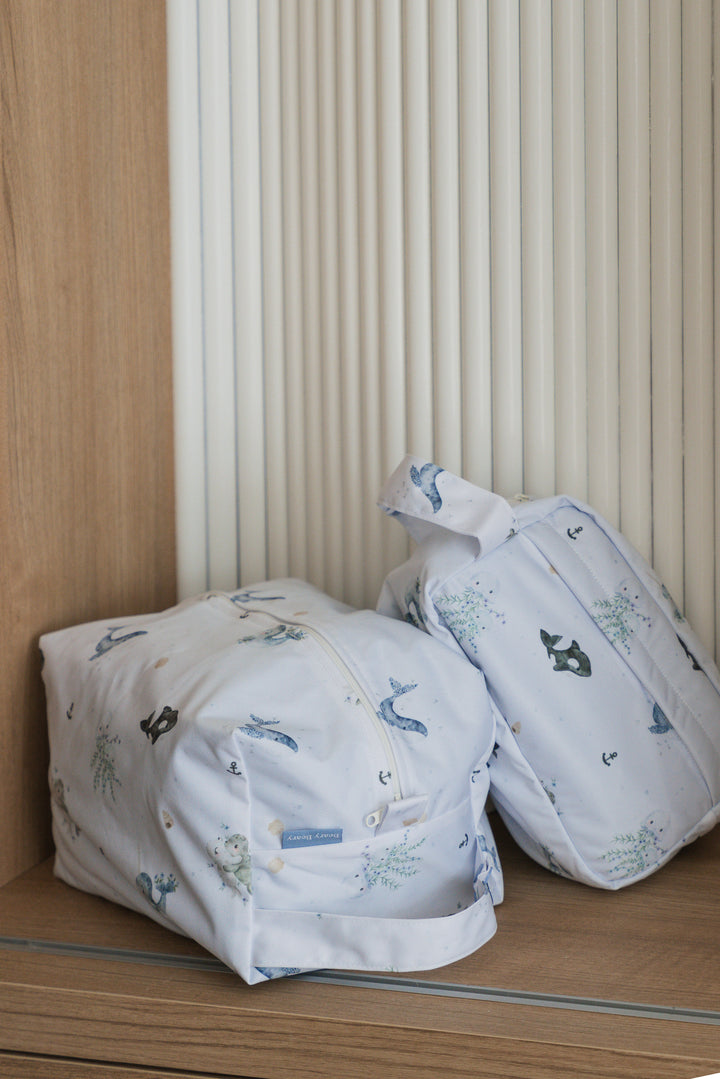 This size features double pockets to keep wet and dry items separated, with a wide opening for easy access. Ideal for childcare, it can hold bath items, gym essentials, or swimming gear. It also fits bedding essentials like a blanket and our medium-sized pillow.