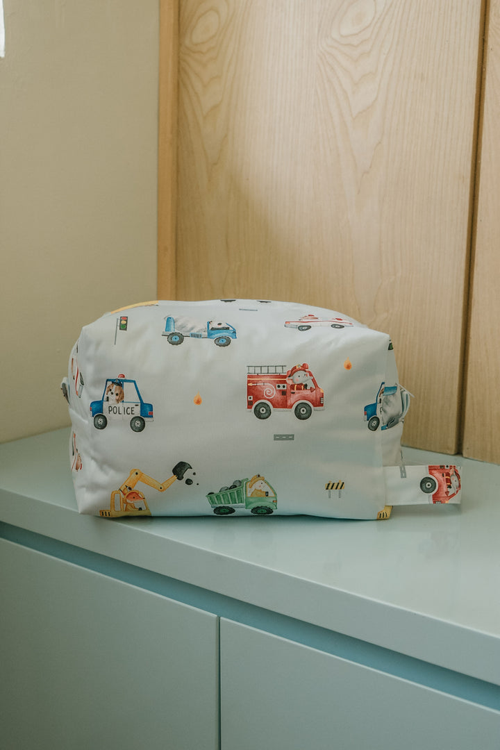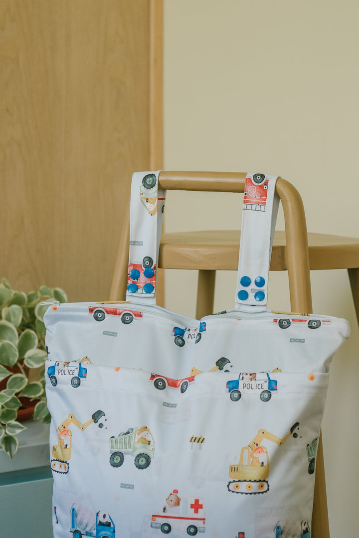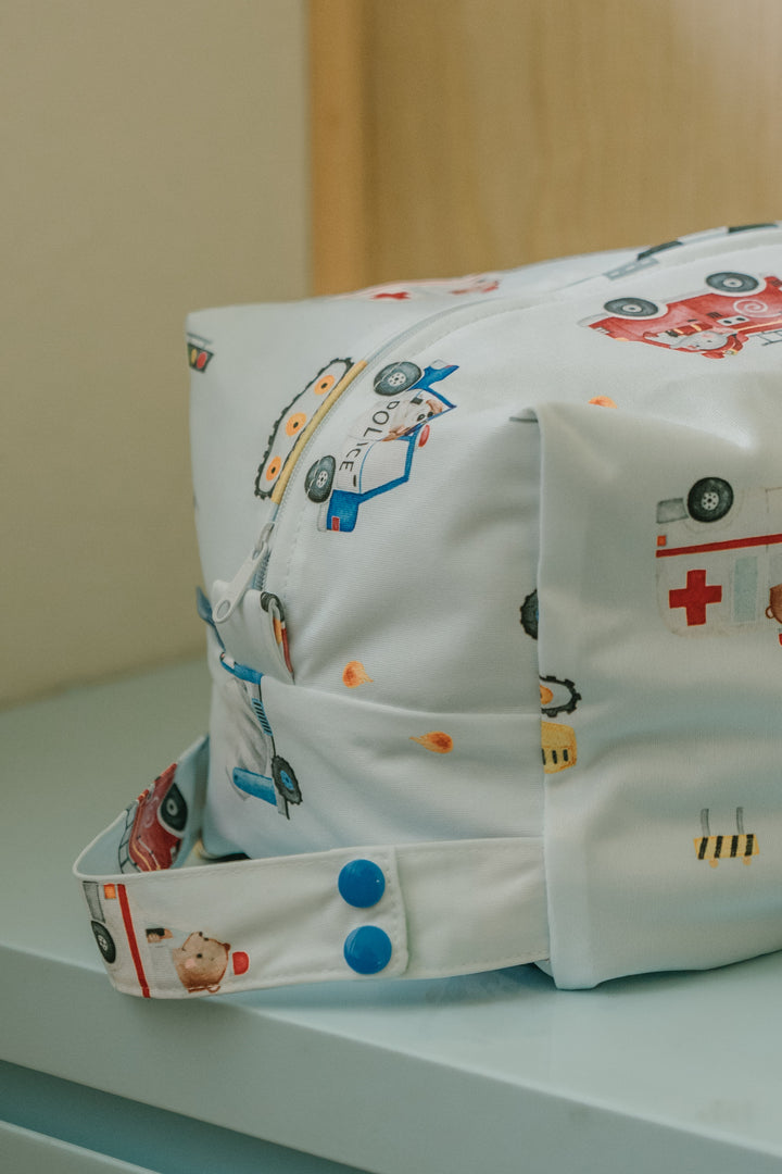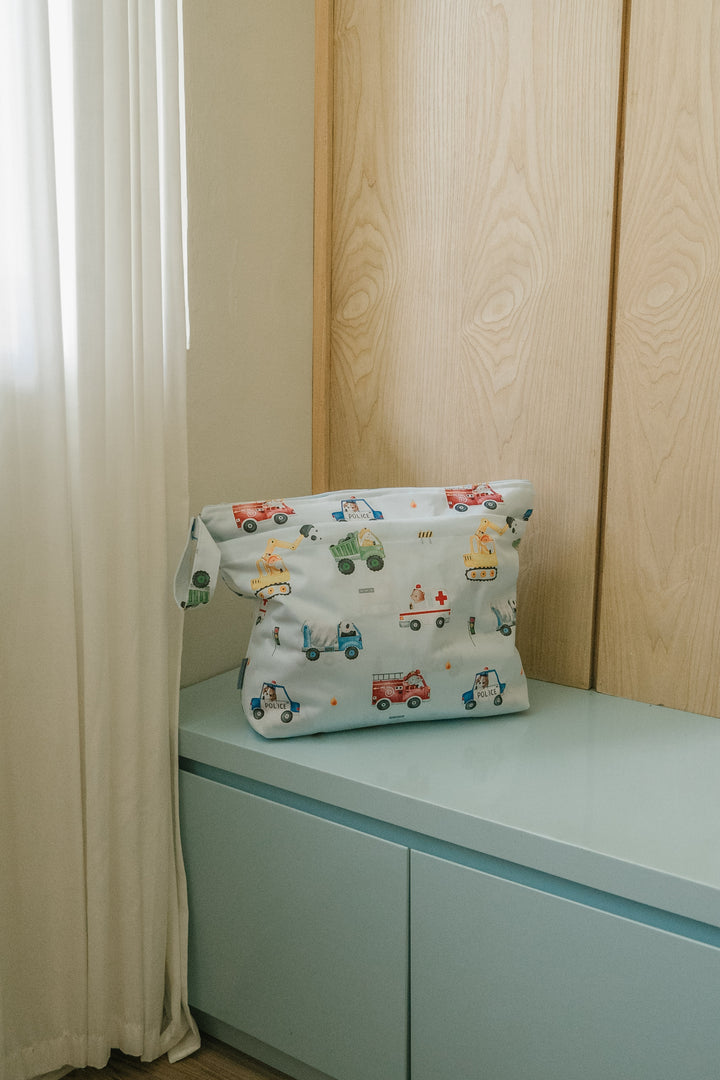 This size features double pockets to keep wet and dry items separated, with a wide opening for easy access. Ideal for childcare, it can hold bath items, gym essentials, or swimming gear. It also fits bedding essentials like a blanket and our medium-sized pillow.