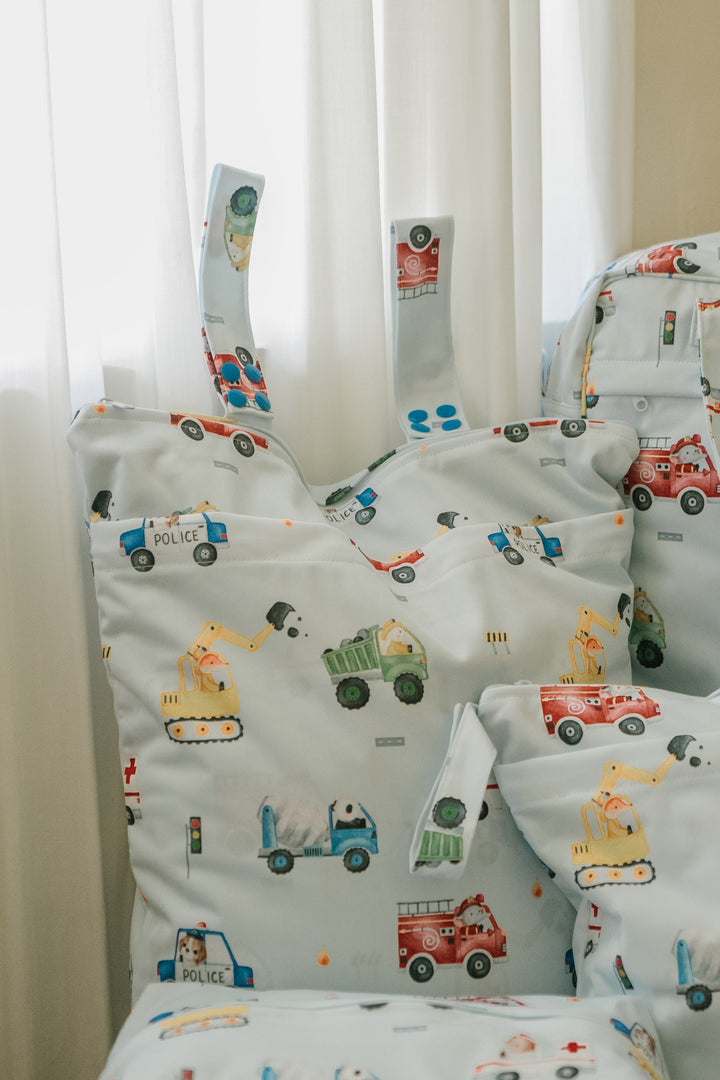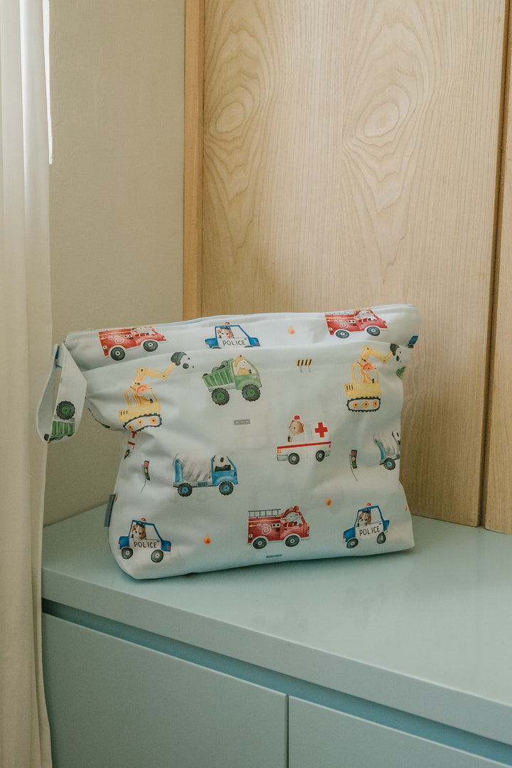 The spacious Size L wet bag also has double pockets for organizing wet and dry items. Perfect for larger items, it serves as an excellent swim bag or storage for sleeping essentials. It can comfortably fit one Toddler Head Pillow or two L-sized pillows. With its double strap design, this bag can be easily hung on a stroller or converted into a shoulder bag, allowing you to carry it hands-free!