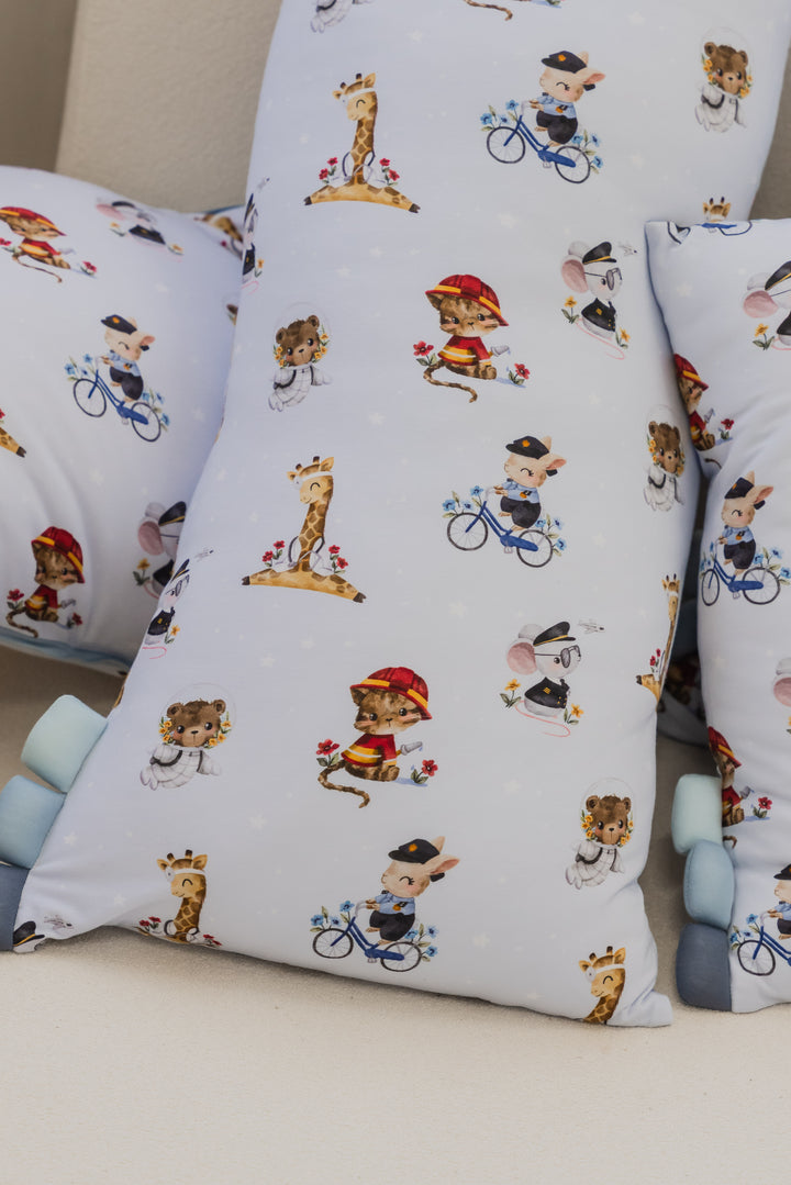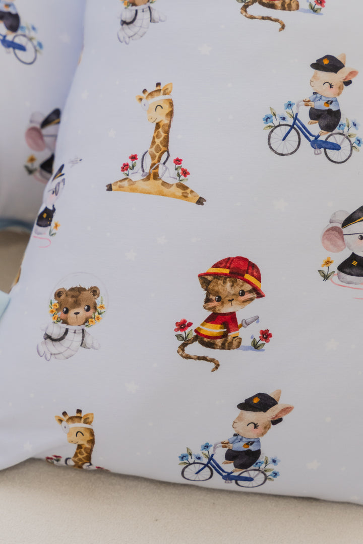 Soar, explore, and save the day with our Big Dreamers: Everyday Heroes print! Set against a calming blue sky, this charming design features a team of brave animal friends ready to make a difference — a daring mouse pilot, a courageous cat fireman, a gentle giraffe doctor, a bold bear astronaut, and a watchful rabbit policeman. Perfect for little ones who dream big and look up to the real-life heroes around them. Inspire courage, kindness, and curiosity — one nap at a time!