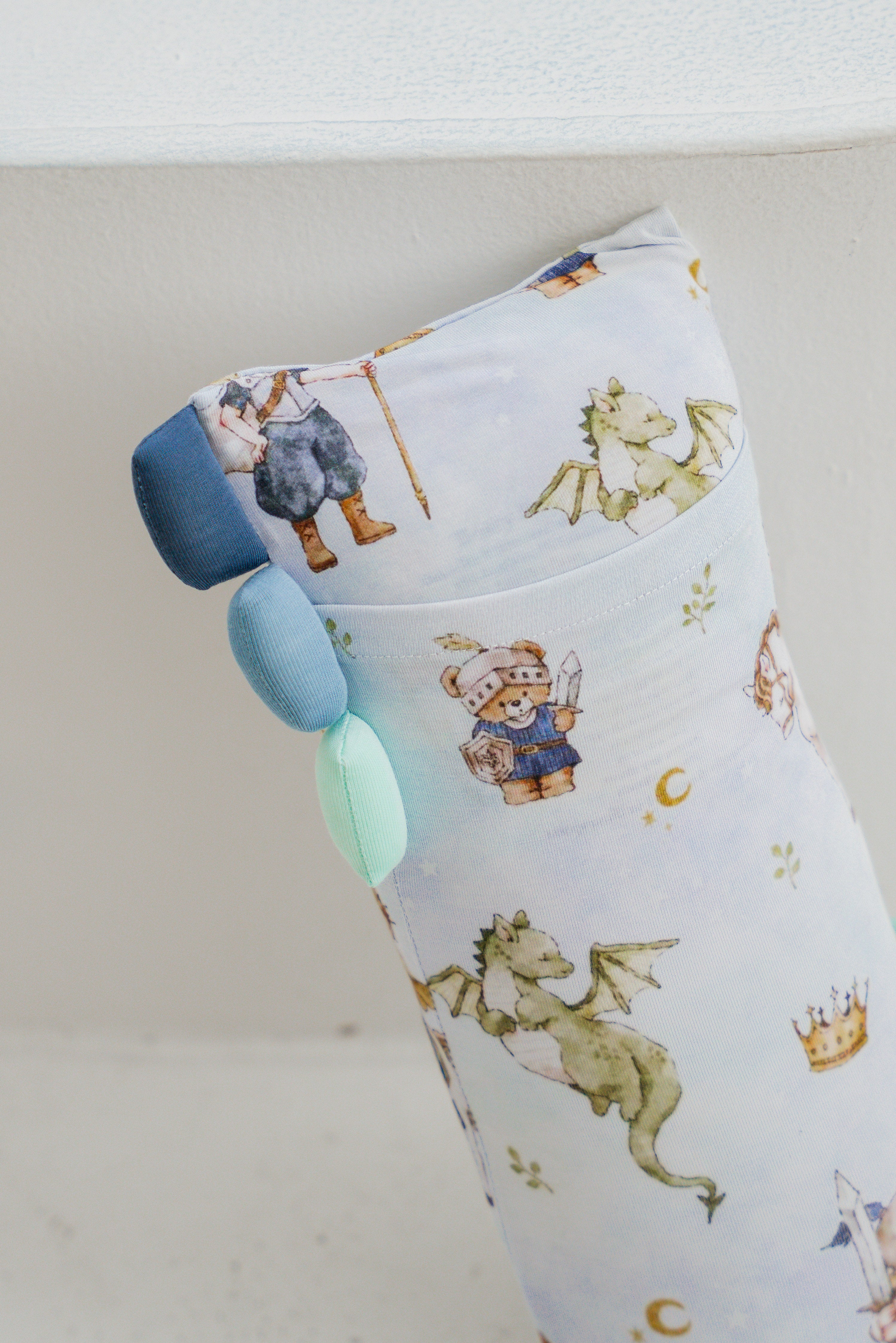 Our Knights’ Adventure print features three brave young knights, one carrying a shining sword, one triumphantly waving a knight’s flag, and one riding proudly on a white horse. Along their journey, they’re joined by a flying dragon, a teddy bear knight and a noble horse companion, each illustrated with charming storybook detail.