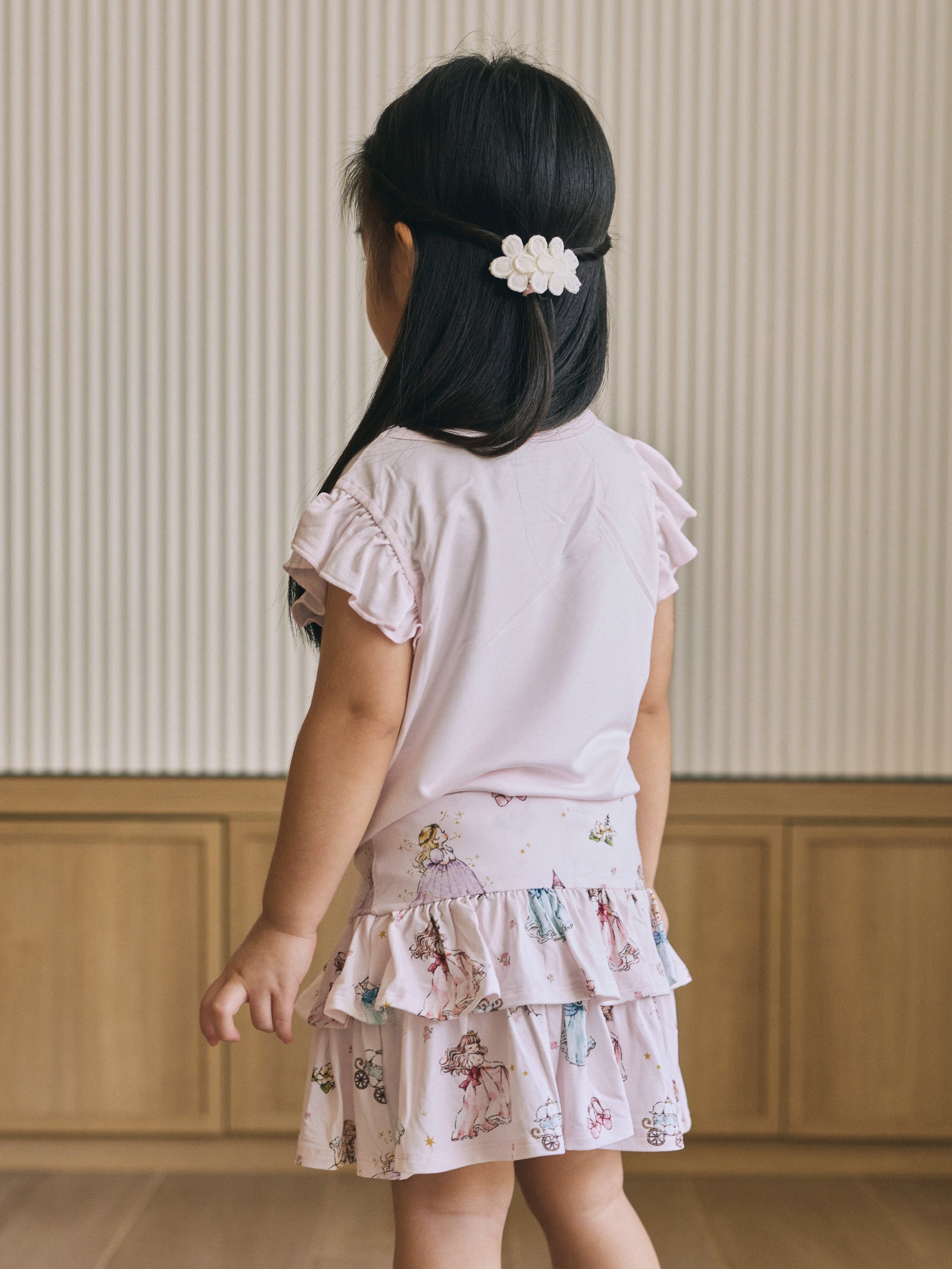 Paired with a tiered skort (yes, it’s a skirt with hidden shorts underneath!), she can dance, play, and explore with total freedom and grace. Perfect for everyday adventures, special playdates, or picture-perfect outings.