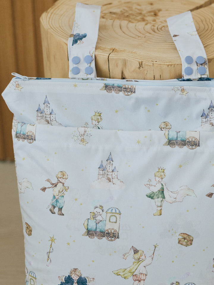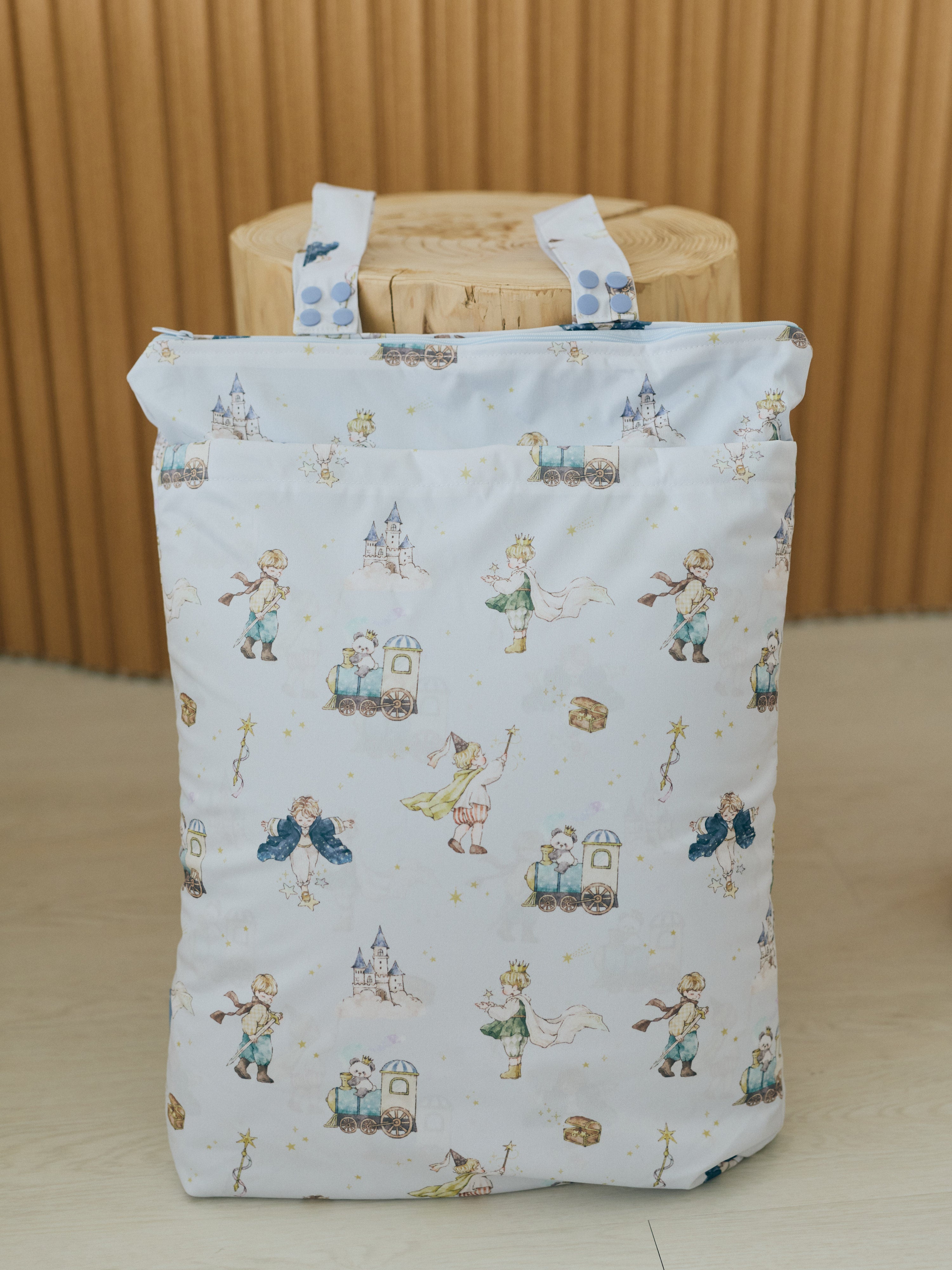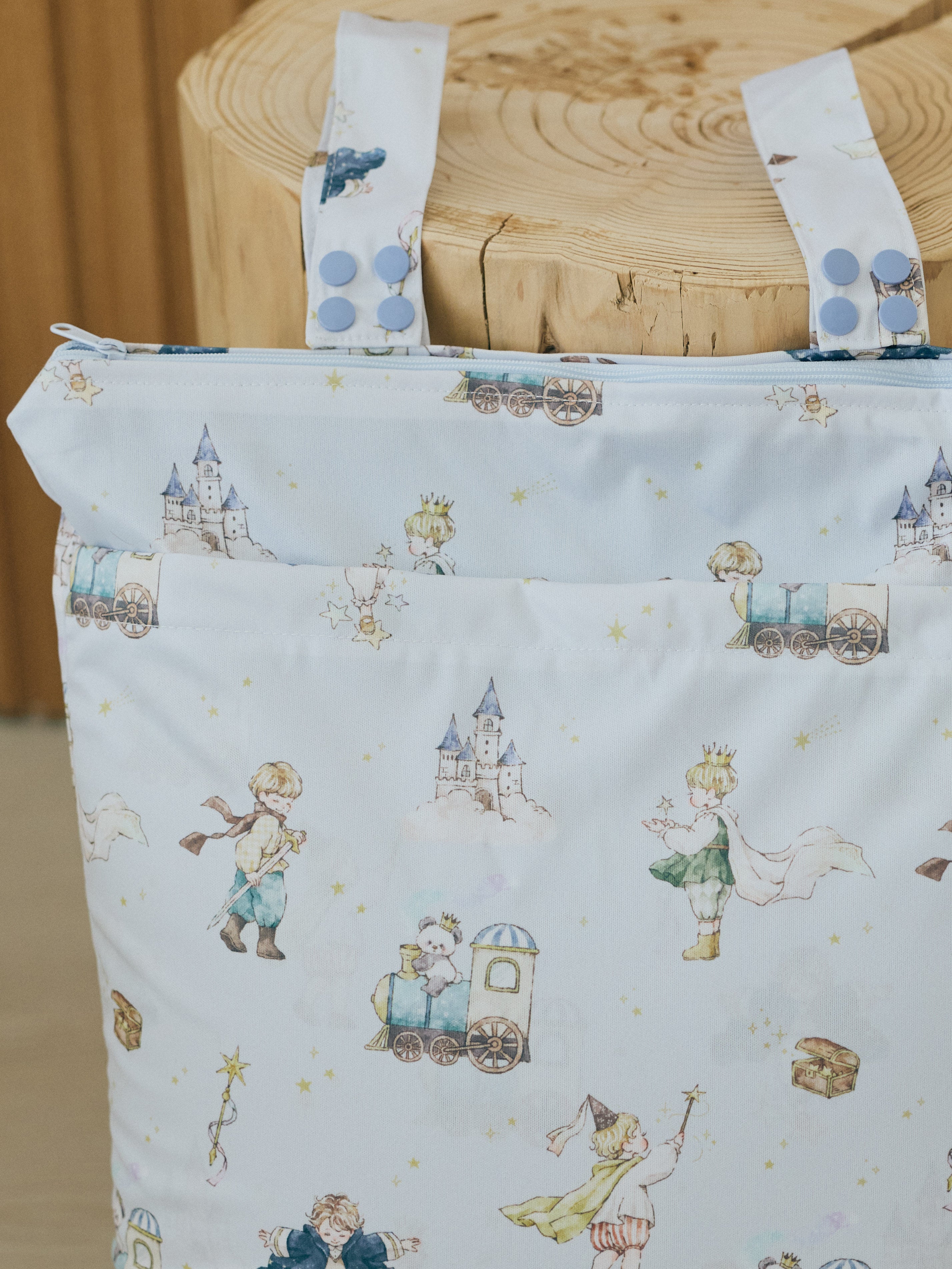 This size features double pockets to keep wet and dry items separated, with a wide opening for easy access. Ideal for childcare, it can hold bath items, gym essentials, or swimming gear. It also fits bedding essentials like a blanket and our medium-sized pillow.