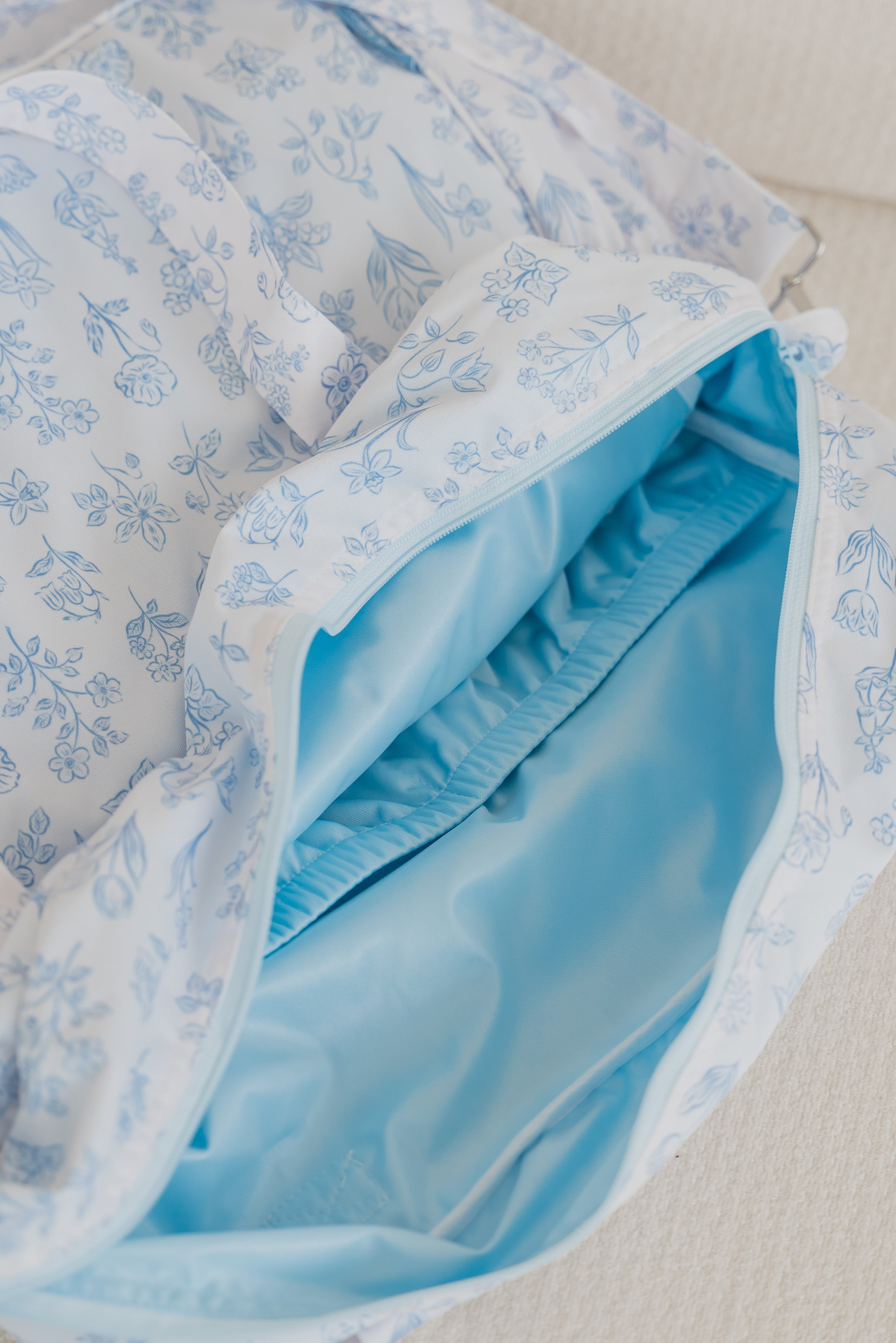 This size features double pockets to keep wet and dry items separated, with a wide opening for easy access. Ideal for childcare, it can hold bath items, gym essentials, or swimming gear. It also fits bedding essentials like a blanket and our medium-sized pillow.